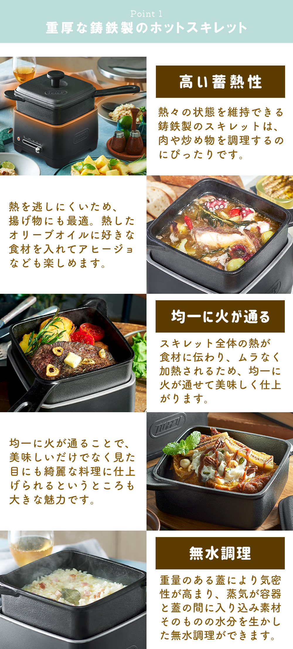 蓄熱性が高く、食材に均一に火が通る重厚な鋳鉄製のホットスキレット。ステーキやハンバーグなどの肉料理から、重量のある蓋を用いた無水レシピまで楽しめ、付属の減煙プレートで【減煙焼肉】も楽しめるます。