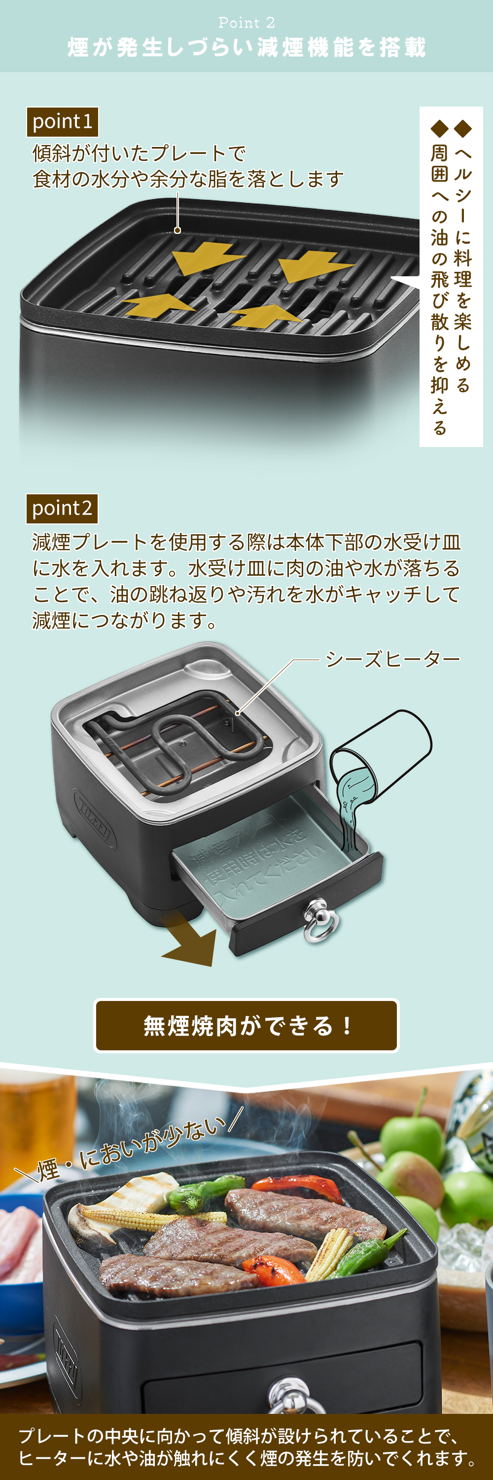 煙は加熱部分に油が触れることで発生します。プレートは傾斜をつけて油を一カ所に集め、穴から下に落とすことで過熱部に触れにくい仕様になっていて、下の引き出しの水に直接油や水が落ちる仕様で、煙や臭いの発生を防ぐことができます。