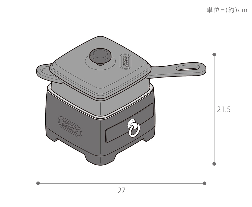 | 本体サイズ | (約)幅27×奥行27×高さ21.5cm (加熱台にスキレットをのせた場合) (約)幅18×奥行21.5×高さ13cm (加熱台に付属の減煙プレートをのせた場合) (約)幅26×奥行26×高さ11cm (スキレットのみ) |