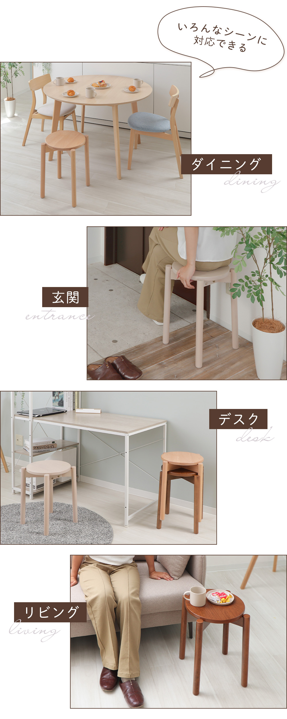 食卓で思わず「Yummy」と笑顔がこぼれるような温かな空間を提供したい、そんな思いからできあがったダイニングシリーズ。スタッキングできる円形のスツールが登場しました。フラットな座面なのでサブテーブルとしてもお使いいただけます。