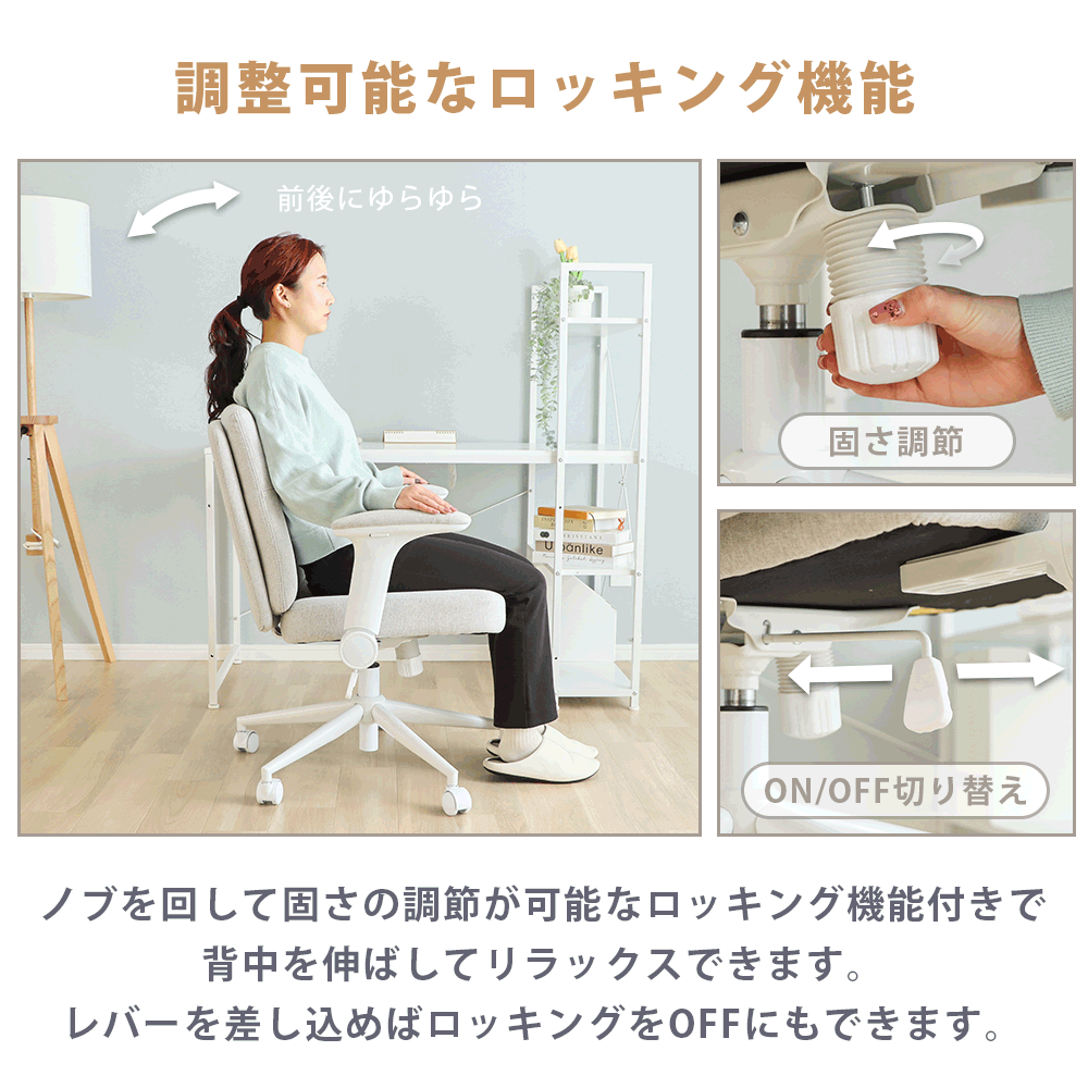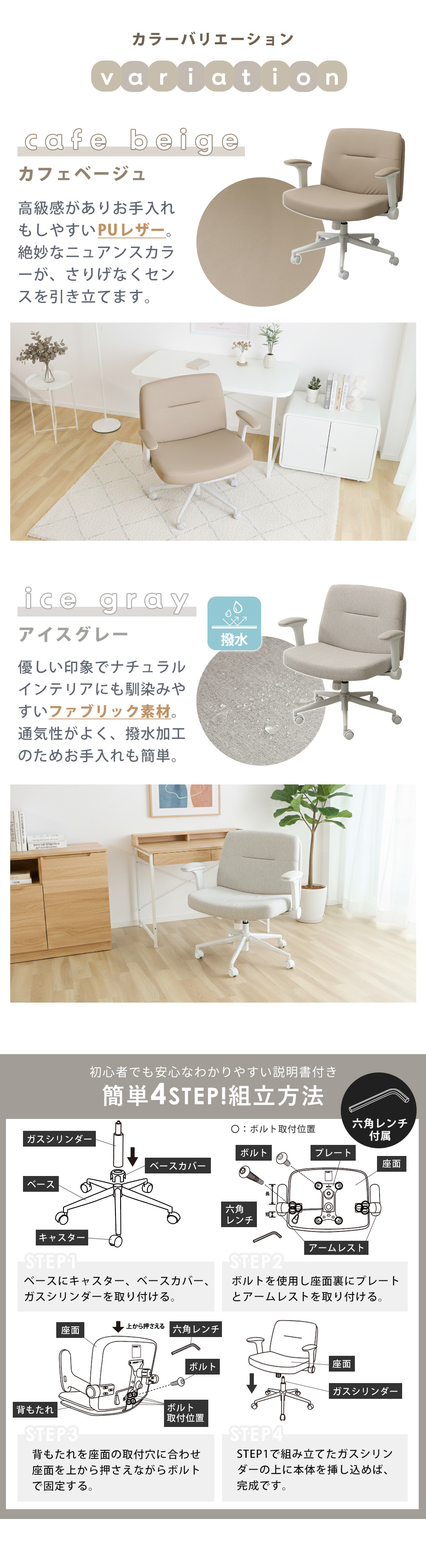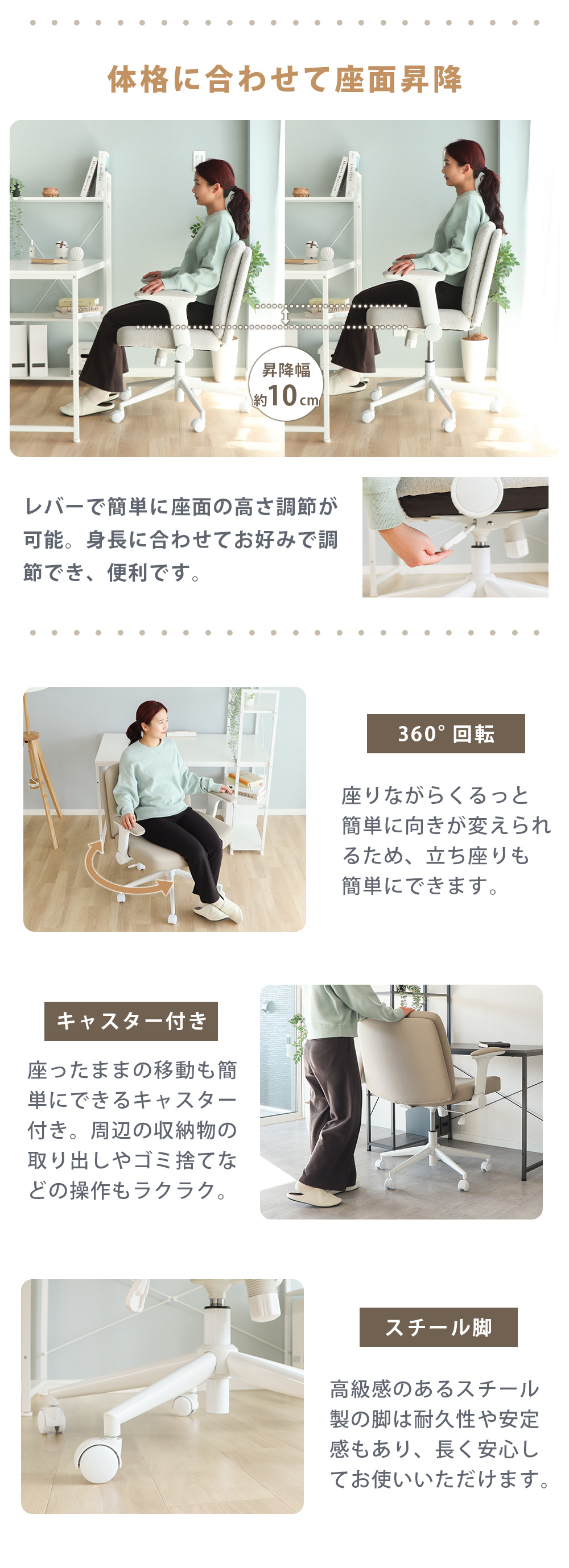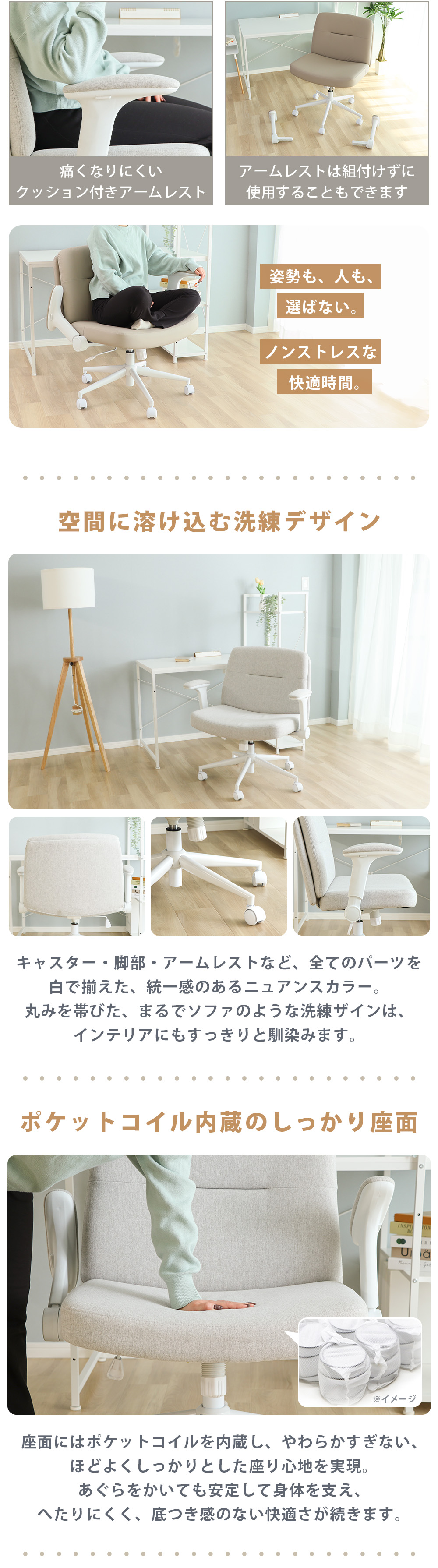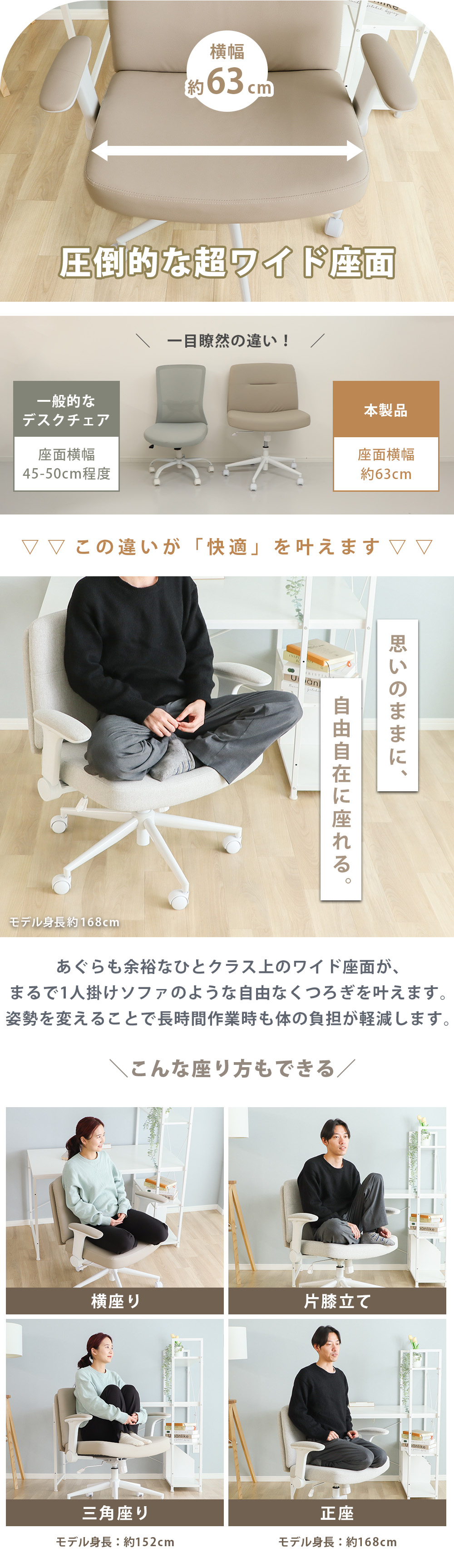 あぐらも余裕な超ワイド座面で、思いのままに座れるデスクチェア。アームレストも7段階の高さ調節と跳ね上げが可能で、体格や姿勢に合わせて自由に調整でき、収納の際も机に引っ掛かりにくく、ノンストレスで快適に過ごせます。幅広でも圧迫感のないローバックタイプで、キャスターや脚部などのパーツまで統一感のあるニュアンスカラーのため、インテリアにもオシャレにすっきりと馴染みます。座面にはポケットコイルを内蔵し、へたりにくく、安定して身体を支えます。固さの調節が可能なロッキング機能や座面昇降機能、移動に便利なキャスターなど、チェアとしての機能も充実。高級感があるPUレザーのカフェベージュと撥水加工を施した通気性のよいファブリック素材のアイスグレーの2色からお選びいただけます。