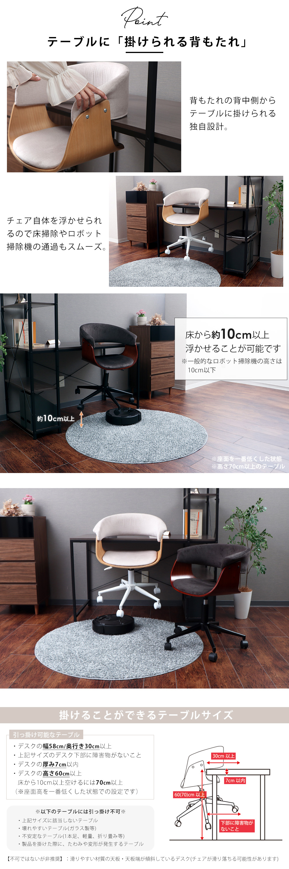 チェア下のモップ掛けやお掃除ロボットも通る ”掛けられるデスクチェア“です。