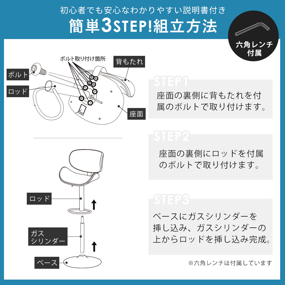 | サイズ | 約幅52×奥行53×高さ94〜114.5cm 座面高:約63.5〜84cm |