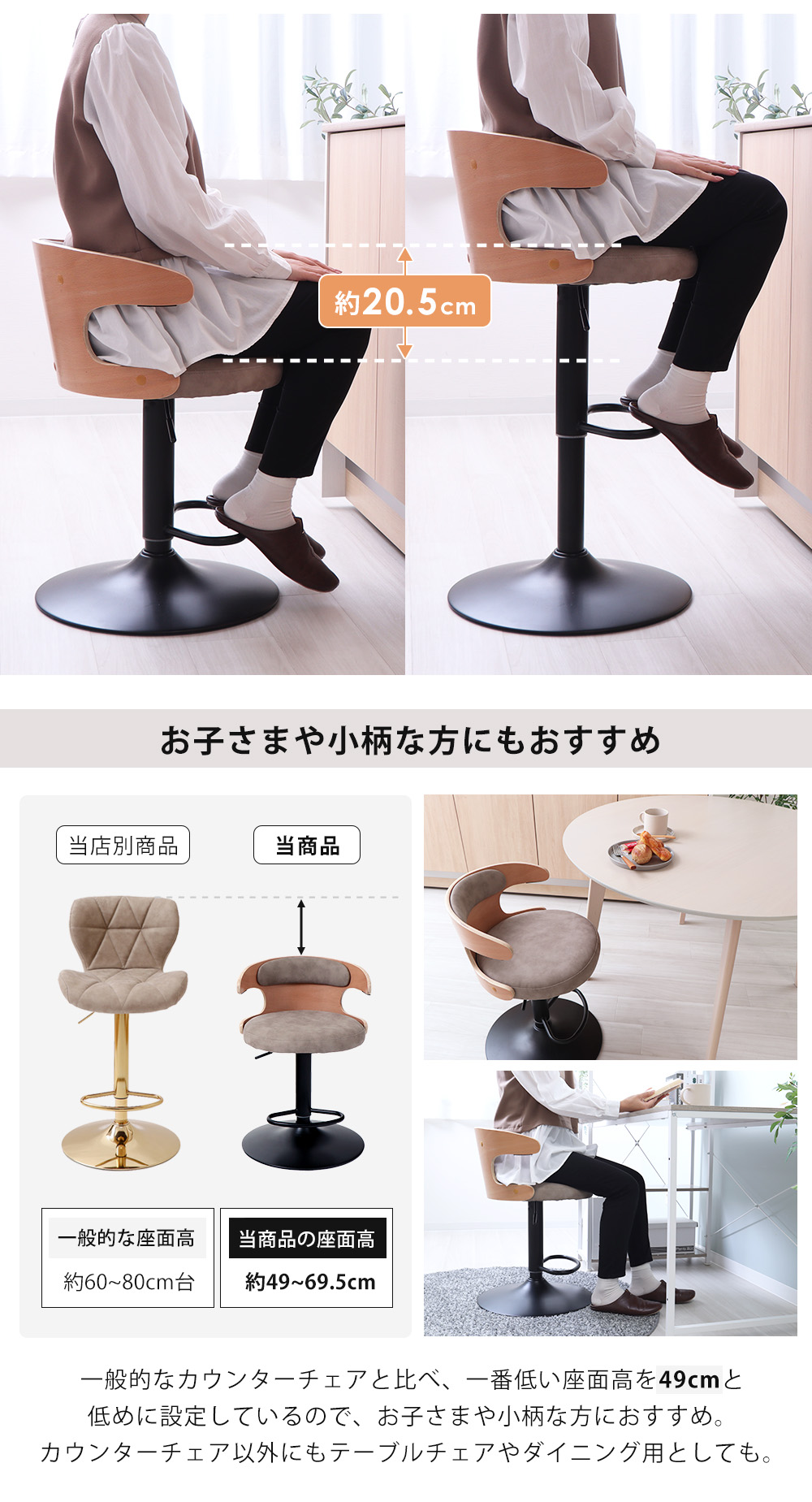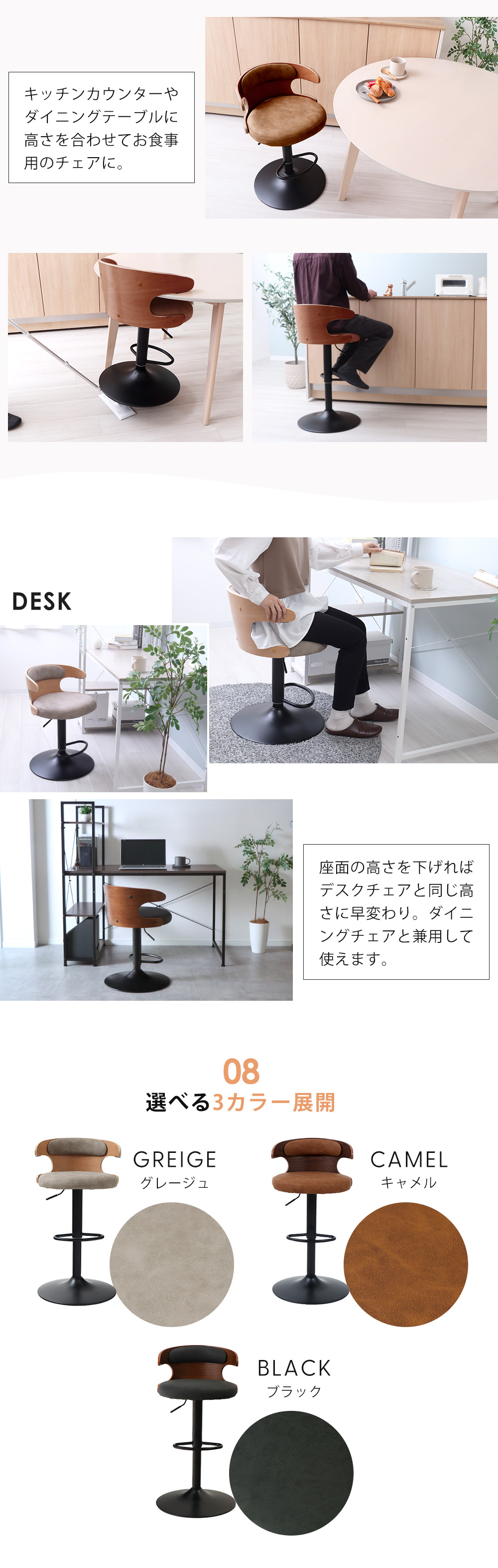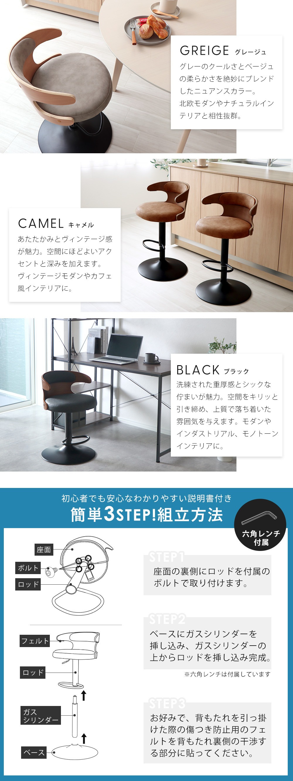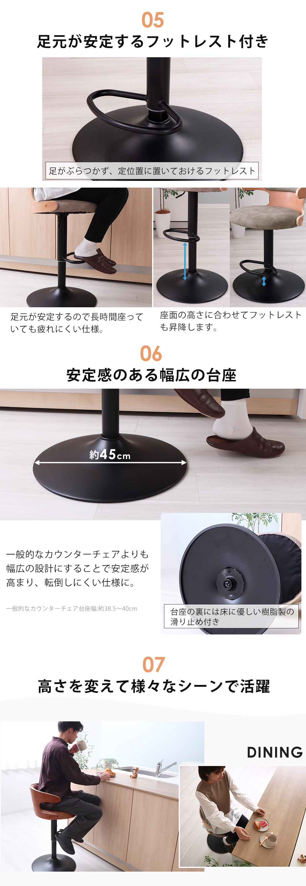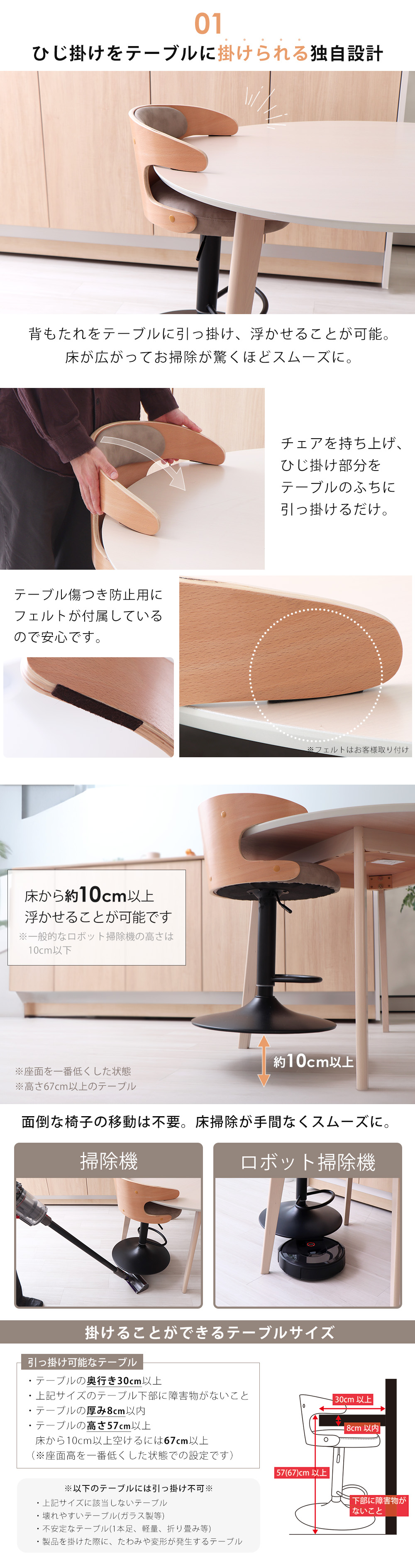 バーチェア「COLGAR(コルガー)」最大の特長は、背もたれをテーブルに掛けられる設計。床に脚がつかないため、掃除機やロボット掃除機もスムーズに使え、毎日の床掃除がぐっと楽になります。キッチンカウンターやダイニングで使いやすい高さ調節(約66〜86.5cm)と360°回転機能付きで、立ち座りも快適。フットレスト付きで安定感があり、長時間の使用でも疲れにくい設計です。無駄のないシンプルなデザインは空間に自然に馴染み、耐荷重約100kgの安心仕様。「掛けられる」からこそ叶う、清潔感と使いやすさを両立したハイチェアです。
