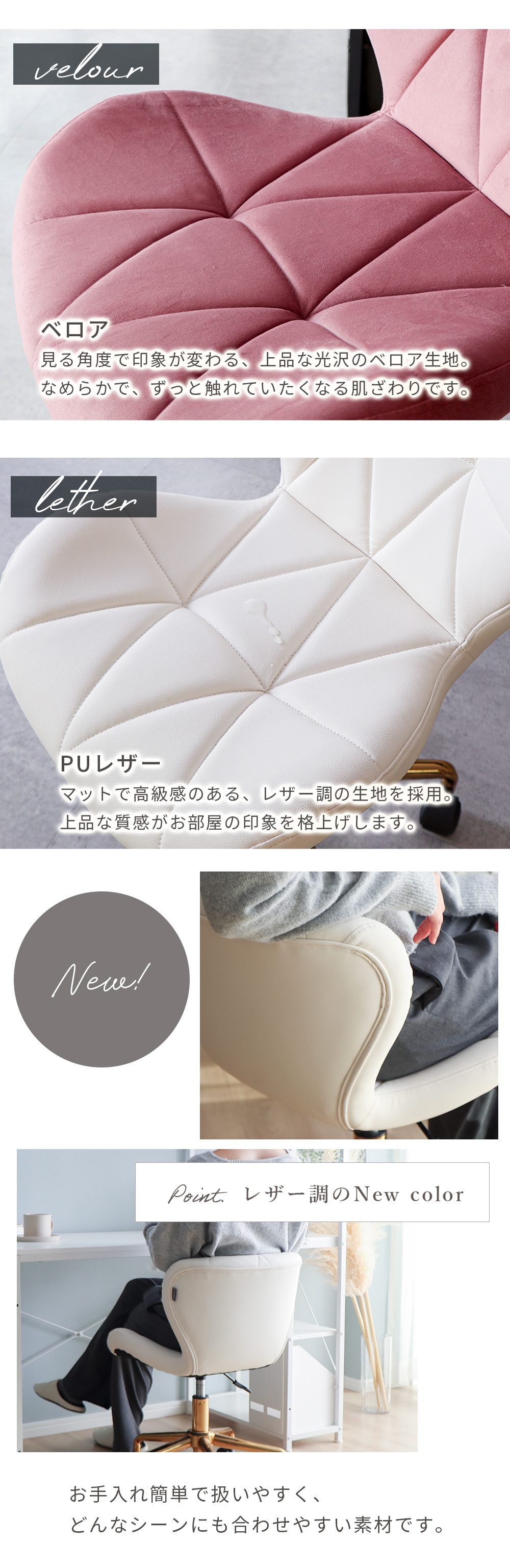| 備考 | お客様組み立て品 (本体に脚とキャスターを差し込むだけの簡単組み立てです。) ※ベロア素材の特性上、中綿の細かな繊維が外側に飛び出ることがあります。ご使用には問題ございませんのでご安心くださいませ。 【お手入れ方法について】 汚れが目立つ場合は、布に薄めた中性洗剤を湿らせて固く絞り、汚れが広がらない様にたたき拭きをしてください。(汚れの状態によっては除去できないものもあります。) ※汗や水で服が湿った状態で座り続けると、色移りが起こる場合がございますのでご注意くださいませ。 【ベースカバーに関しまして】 ベースカバーは部品の仕様上、ベースの脚に傷がつかないように大きめに設計しております。多少の段差や床の素材により振動が直接届き音がなる場合がございますが、安全上の問題はございません。ベースの溶接部分の目隠しのために付属しておりますので、どうしても音が気になる場合は取り外してご使用いただくかマット等を敷いてのご使用をお試しくださいませ。 ※店舗内の全商品において、サイズ表記は(約)での表記でございます。±1〜2cm程度の誤差は許容範囲内と判断し出荷しております。 ※個体差やロット・モニター環境により、色味やサイズが若干異なる場合がございます。 ※成人の標準体型に合わせた設計となっております。お子様や体重の軽い方は座面の昇降ができない場合がございます。 上記予めご了承の上ご注文くださいませ。 【FAQ】こちらの商品の特徴・注意事項について ※必ずお読みください※ |