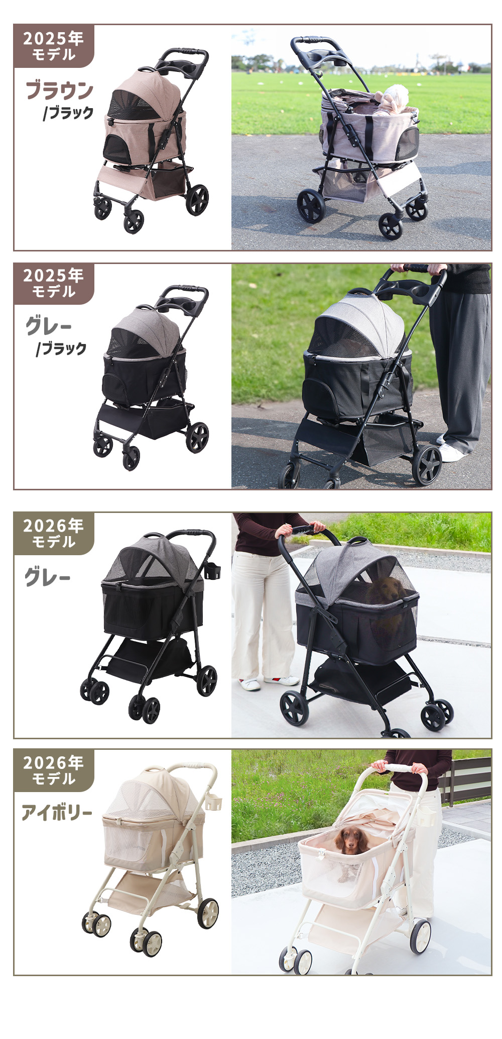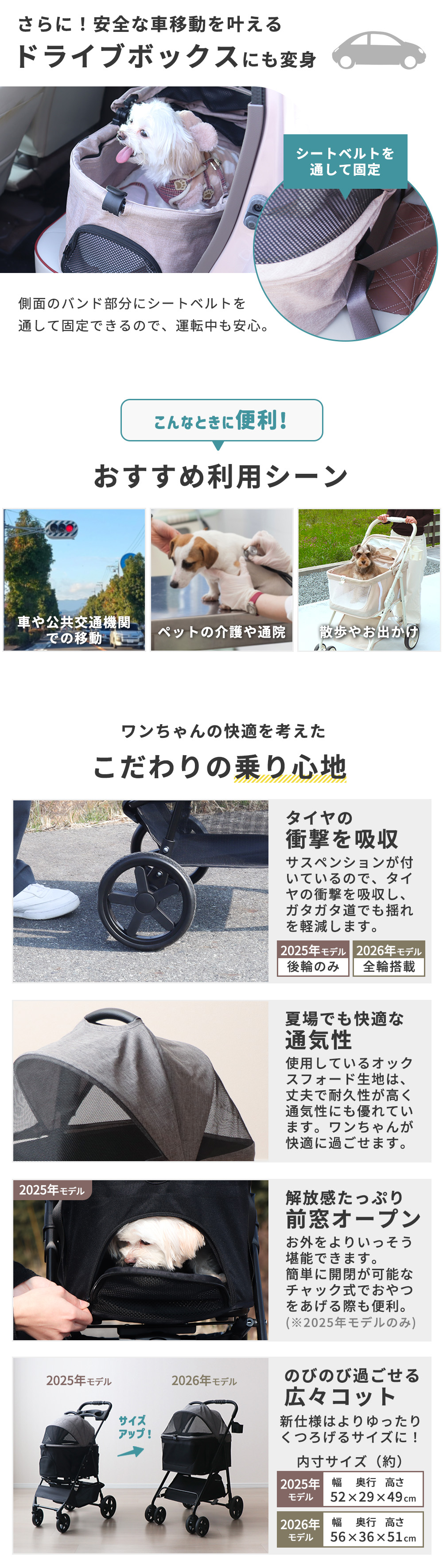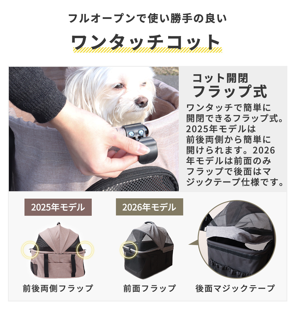 コットを取り外してワンタッチでカートの折り畳みができる、カート・キャリー・ドライブボックスの3wayで使えるペットカート。欲しい機能は盛り込みつつお求めやすくした「ベーシックモデル」に、2026年モデルが登場!コットの内寸サイズアップやサスペンションを全輪に搭載など、お客様のお声を元に「より便利で快適」を目指しました。コットはワンタッチで簡単にフルオープンまで開けられるフラップ式。ベアリングを内蔵した小回り抜群なタイヤにはロックも付いており、大容量収納や洗える座面カバーなど機能が盛りだくさんの設計です。通気性のよい生地や合成皮革を使用した高級感のあるデザインも魅力的です。