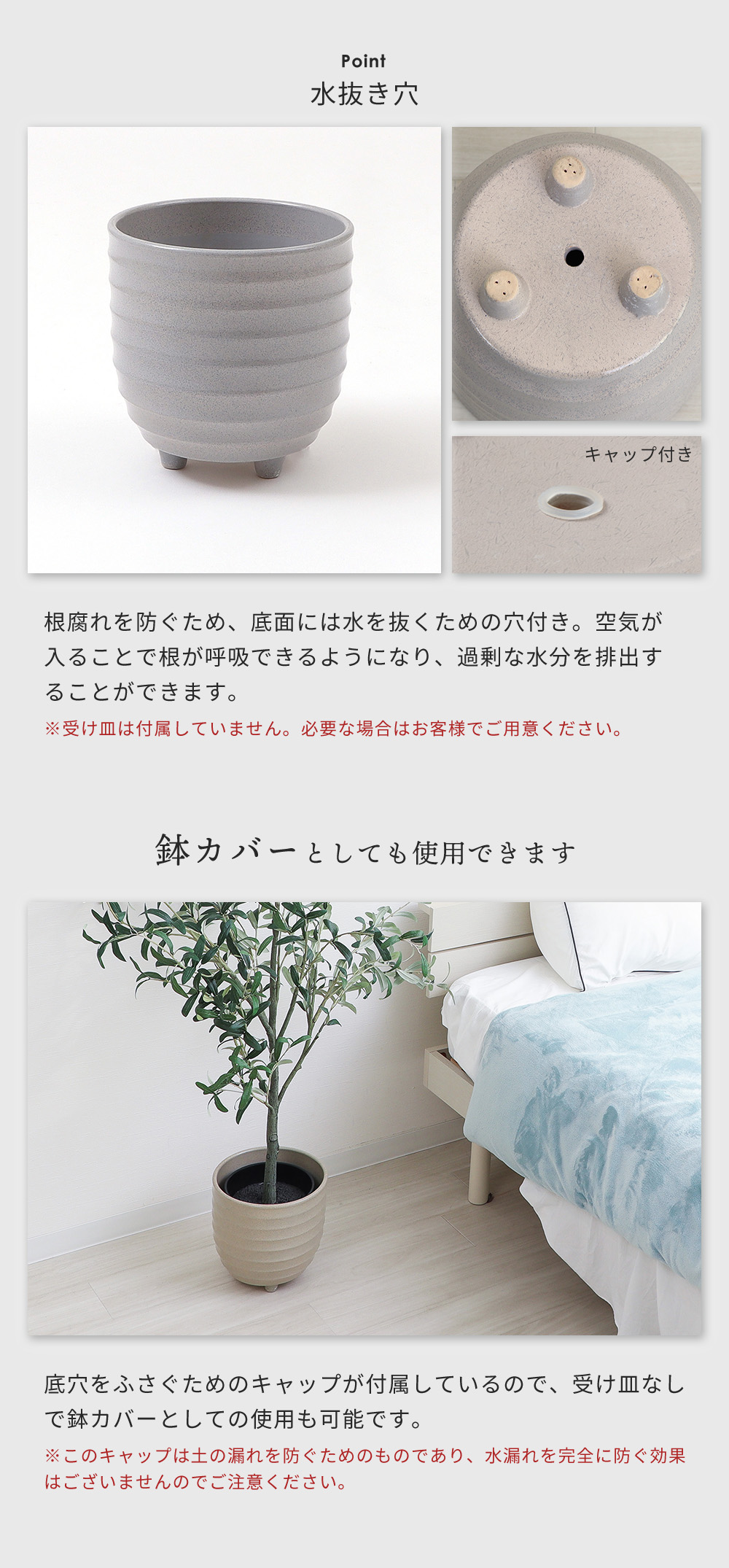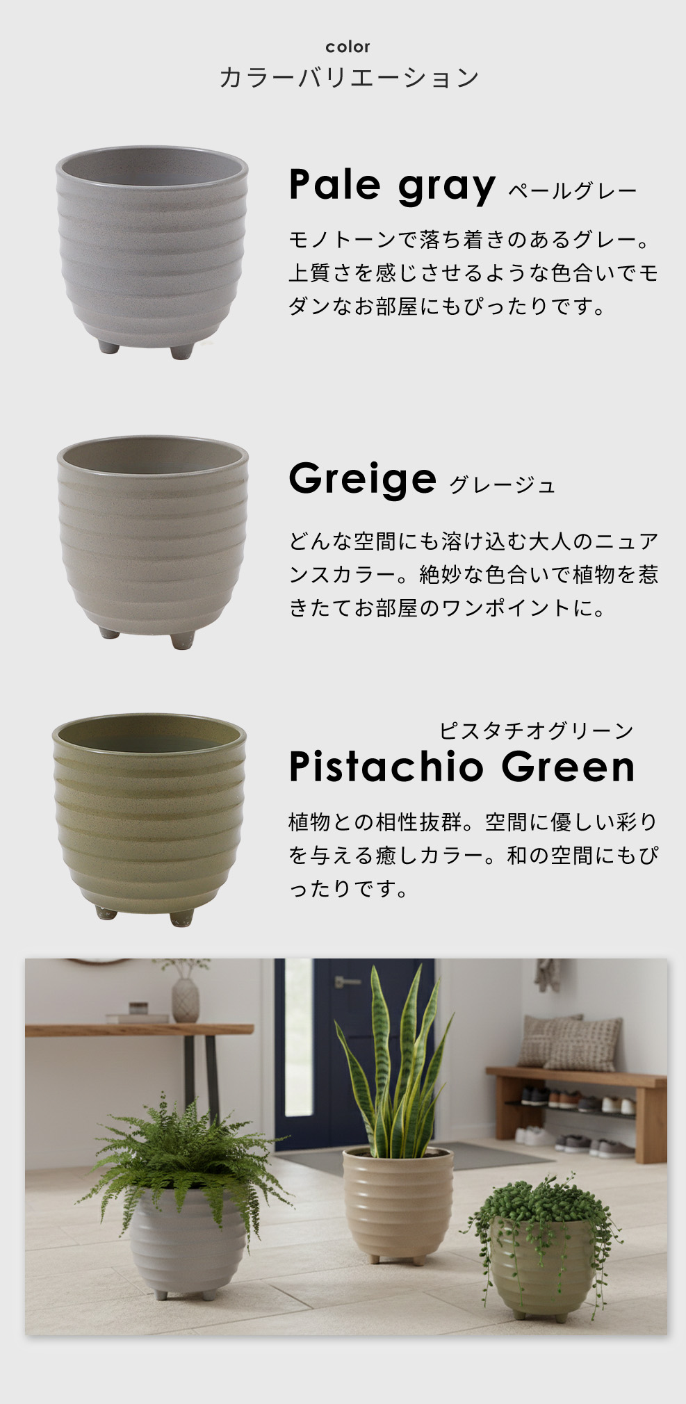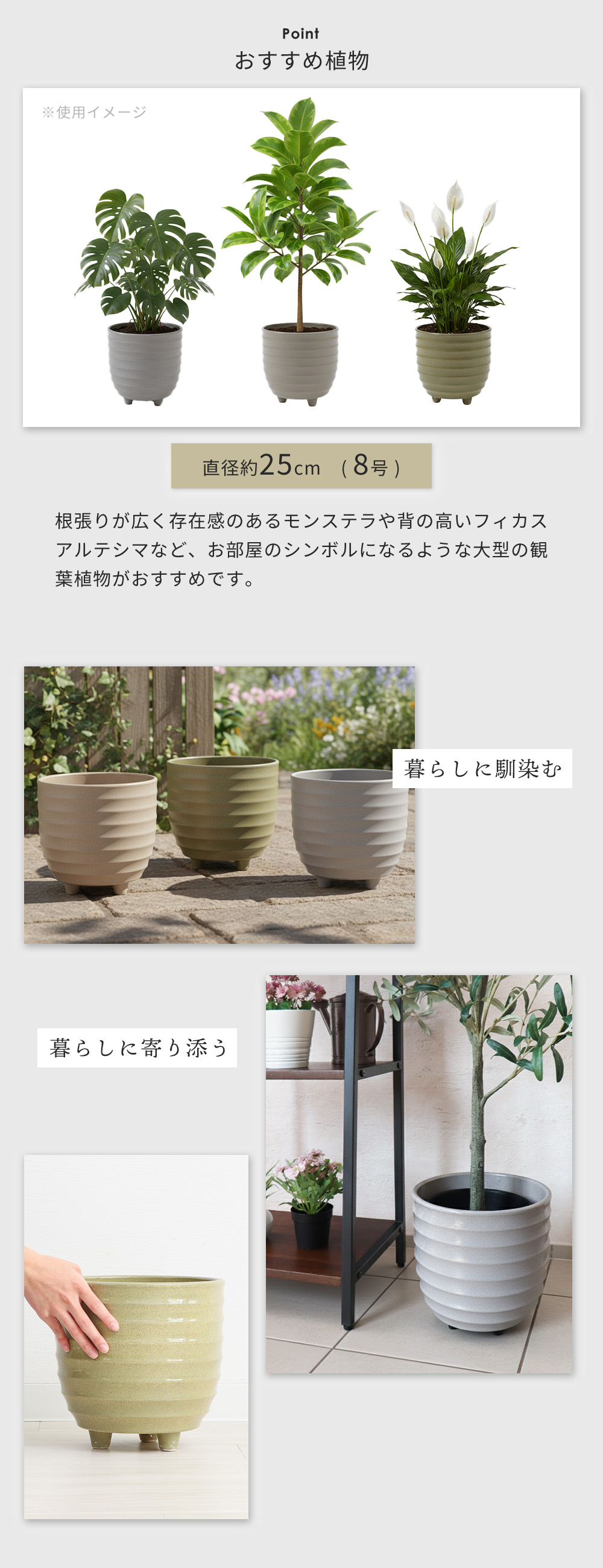鉢 シンプル 屋内 屋外 直径25cm 高さ25cm 中型 大型 可愛い コンパクト 北欧 和風 洋風 グレー ベージュ グリーン 庭 玄関 室内 園芸 波型 リブ 凹凸のある側面 エントランス 観葉植物