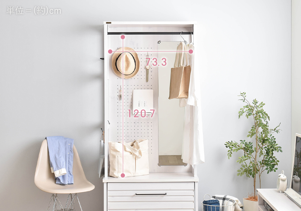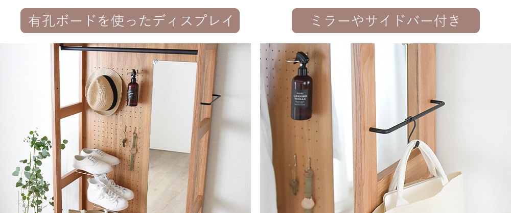 バックボードは、フックを利用して服飾雑貨など小物を掛けておくことができる有孔ボード仕様。ミラーやサイドバーも付いており、日々のコーディネートに使いやすいようにアレンジすることができます。