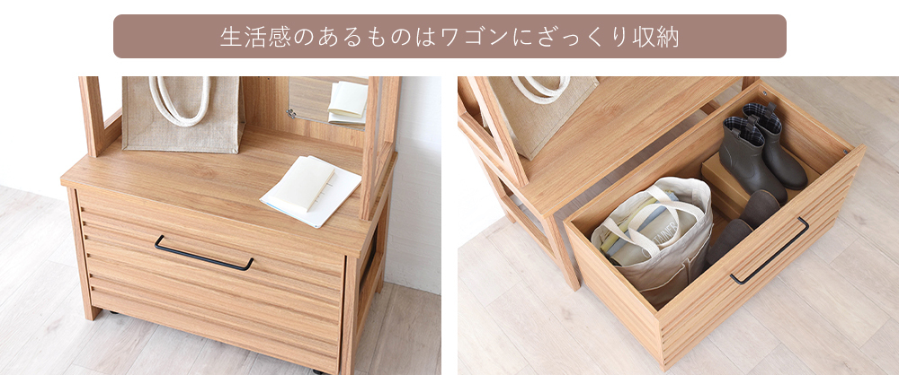 収納場所に困ることが多い、大きめの荷物や衣類がたっぷり入る移動可能なワゴンが付いています。