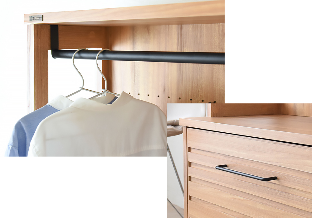 ハンガーバー・取っ手は、マットな質感のスチール製。黒がお部屋の雰囲気を引き締めてくれます。 |