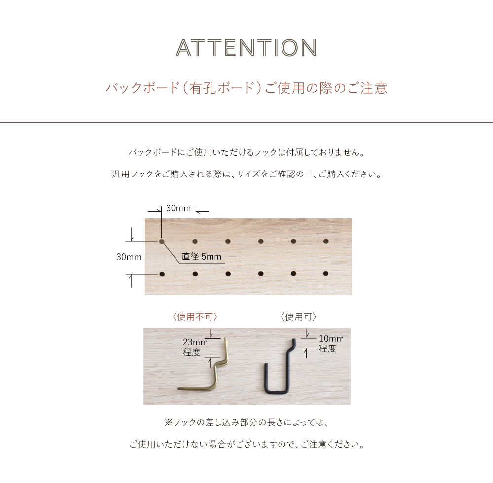 ※バックボードのフックは、付属しておりません。有孔ボード用フックを別途ご用意いただく必要があります。