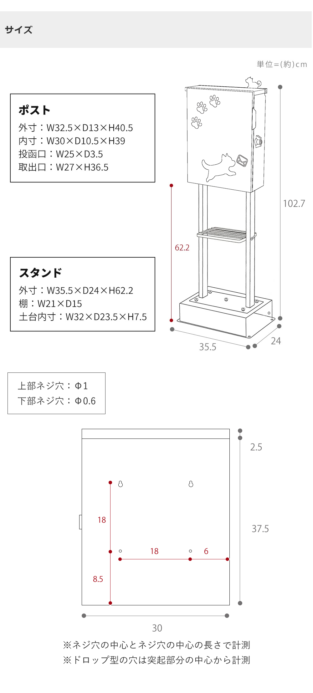 ポスト内寸:約 横幅30×奥行10.5×高さ39cm