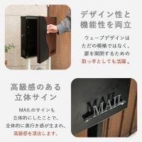 取っ手にもなるおしゃれなウェーブデザインが目を惹く2本脚スタンドポスト。スタンドは取り外せ、壁掛けポストとしても設置できる2way仕様です。MAILの立体サインが高級感を演出します。メール便・レターパック対応の大容量サイズで、投函口は上部にあり、正面からは見えず全体がすっきりした印象に。蓋付きのため、雨の侵入を防ぎ、郵便物を守ります。取り出し口は大きく開き、中身が取り出しやすい設計です。落下防止バーが付いているので、たくさんの郵便物が入っていても安心です。側面には扉を開けずに郵便物を確認できる窓付き。さらに、鍵付きひねり錠が付いているので防犯面も安心です。ハンドルをひねるだけで鍵を使わない簡易施錠も可能です。スタンドには小物を置ける棚付き。スタンドの土台は空洞になっているため、レンガなどを入れて固定していただけます。また、土台の穴を使ってアンカーやワイヤーで固定することも可能です。