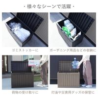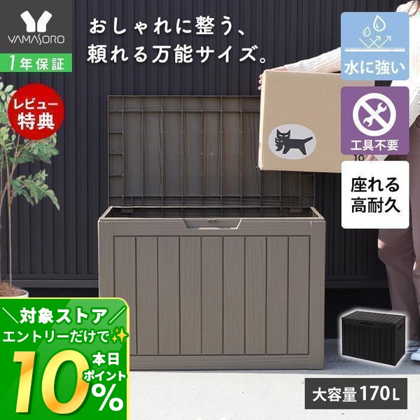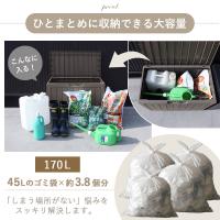 屋外でも屋内でも使用可能な樹脂製の大容量ストレージベンチボックス。樹脂製のため錆びの心配がありません。浸水しにくい構造で水洗いもできるので、お手入れも簡単です。大きめの荷物も受け取れ、ベランダ収納などに最適な170Lサイズは、45Lのゴミ袋が約3.8個分も収納できます。ゴミストッカーとして使用したり、ガーデニング用品やお子さまの遊び道具などの収納に使用したり、灯油や災害用グッズの保管に使用したりと様々なシーンで活躍します。南京錠が取り付けられる鍵穴付きで防犯面も安心のため、宅配ボックスとしてもご使用いただけます。大人も座れる高耐久設計。アウトドアや玄関先の腰掛にもなります。軽量設計&持ち手付きで、簡単に移動できます。丈夫な作りながら、工具不要で板をはめ込むだけの簡単組み立て。本物の木材のような、表面の凹凸感までこだわった繊細な木目柄のお洒落なデザインで、外観やインテリアの雰囲気を損ないません。