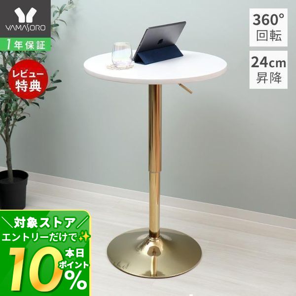 |      バーテーブル Nobilis / ノビリス / お部屋のアクセントになる、昇降可能なバーテーブル。ゴールドカラーがラグジュアリーな印象を与えます。高さはニーズに合わせて調節可能。直径約60cmのコンパクトな丸天板は、360°回転仕様。台座は幅約45cmと広く、安定感があります。  |