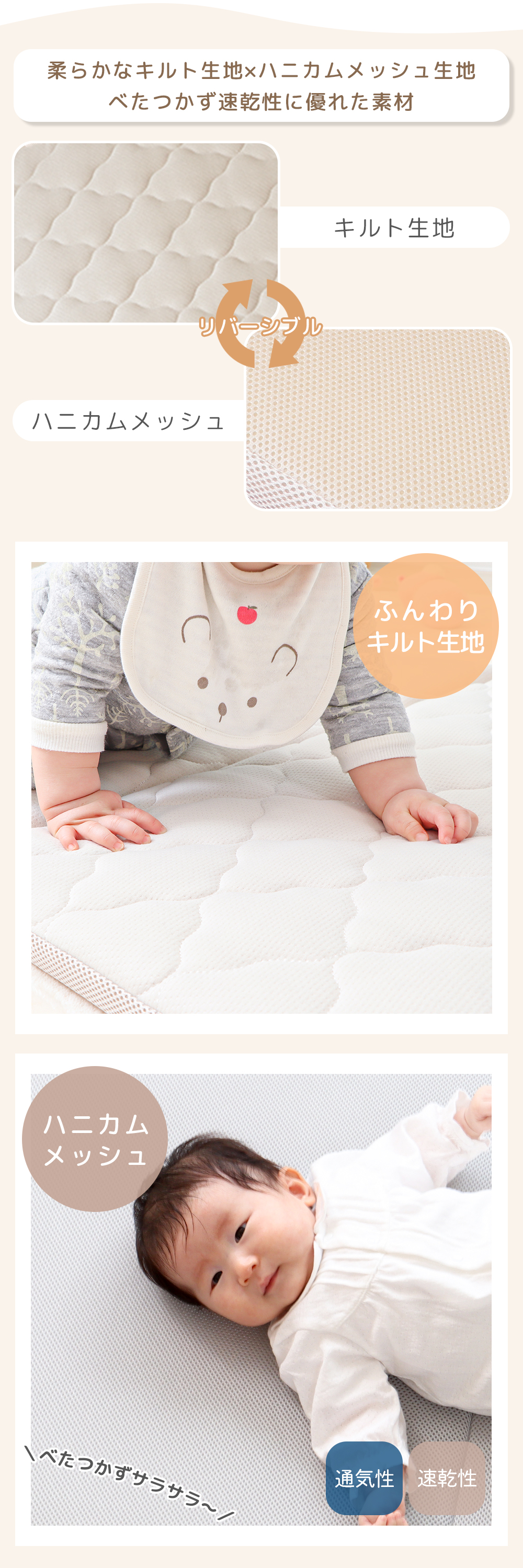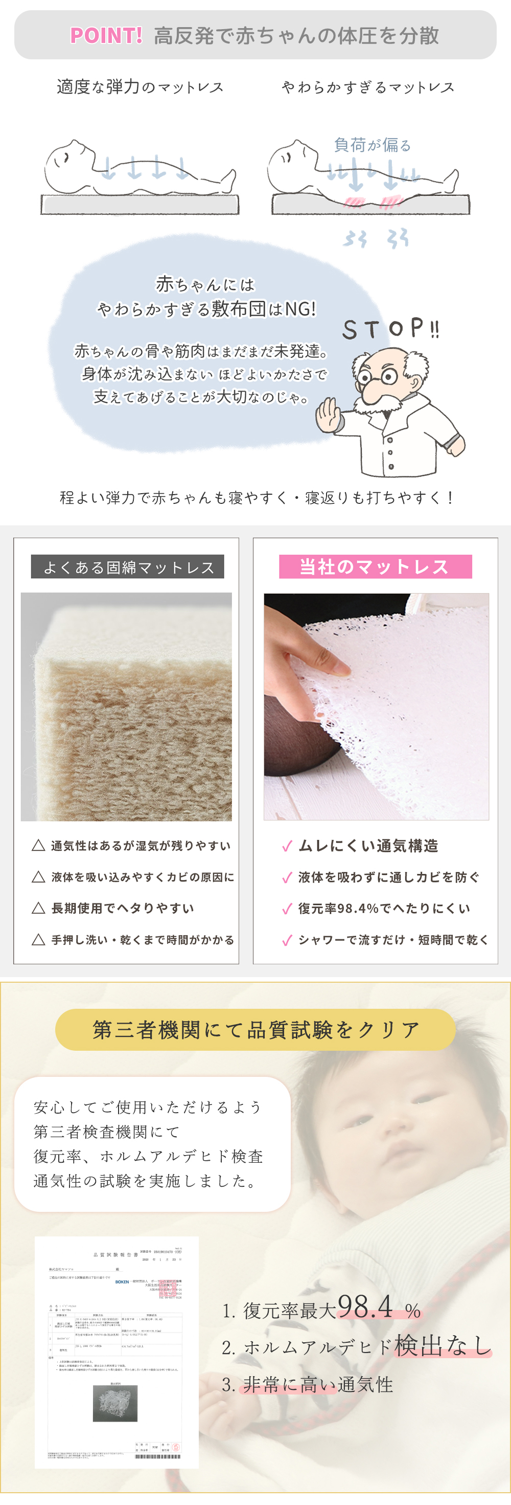 寝ているときも赤ちゃんは汗っかき。だからこだわった通気性も抜群のメッシュ素材のマットレス。お家でジャブジャブ洗えてすぐに乾くので、お母さんのお手入れの負担も軽減させてくれます。