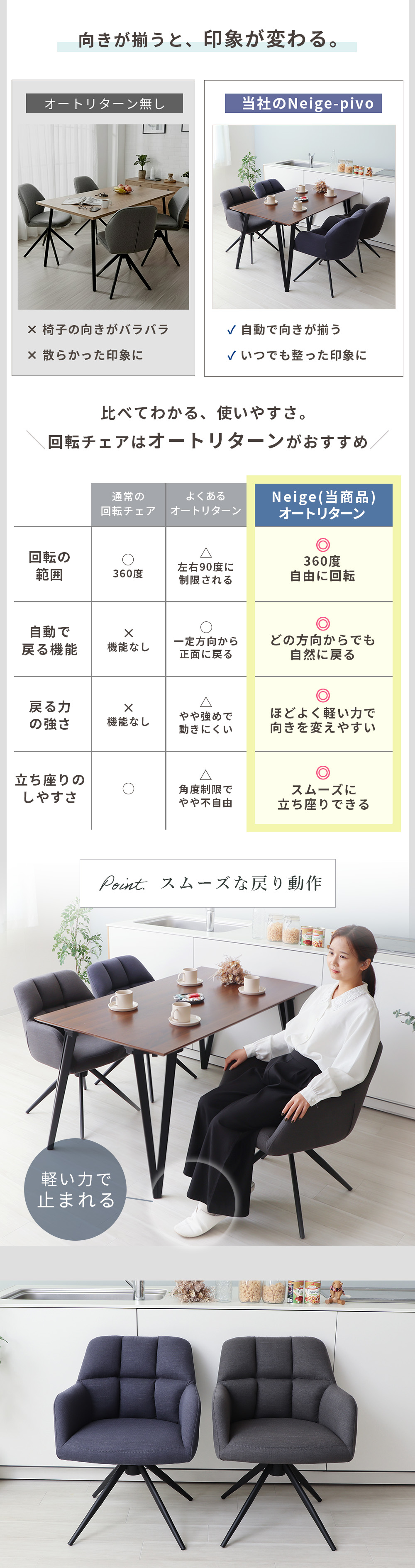 包み込むような座り心地と端正なデザインを併せ持つ、回転式ダイニングチェア「Neige-pivo(ネージュ-ピボ)」。