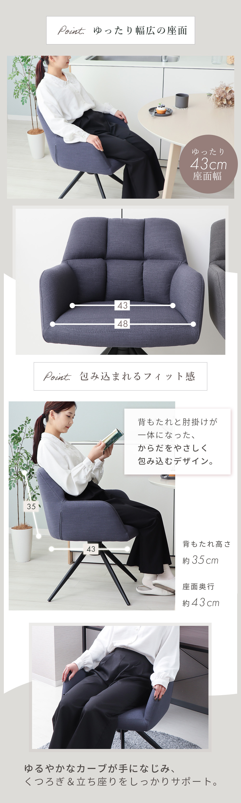 背もたれと肘掛けを一体化した滑らかなフォルムが身体を安定して支え、ゆったりとくつろげます。