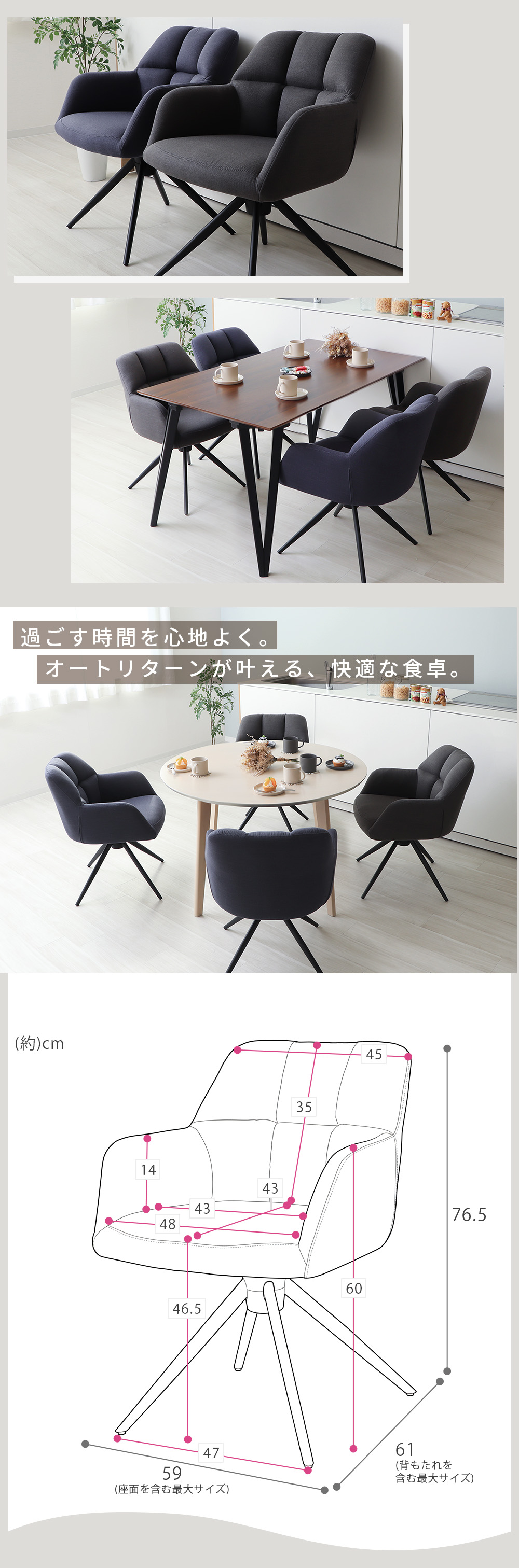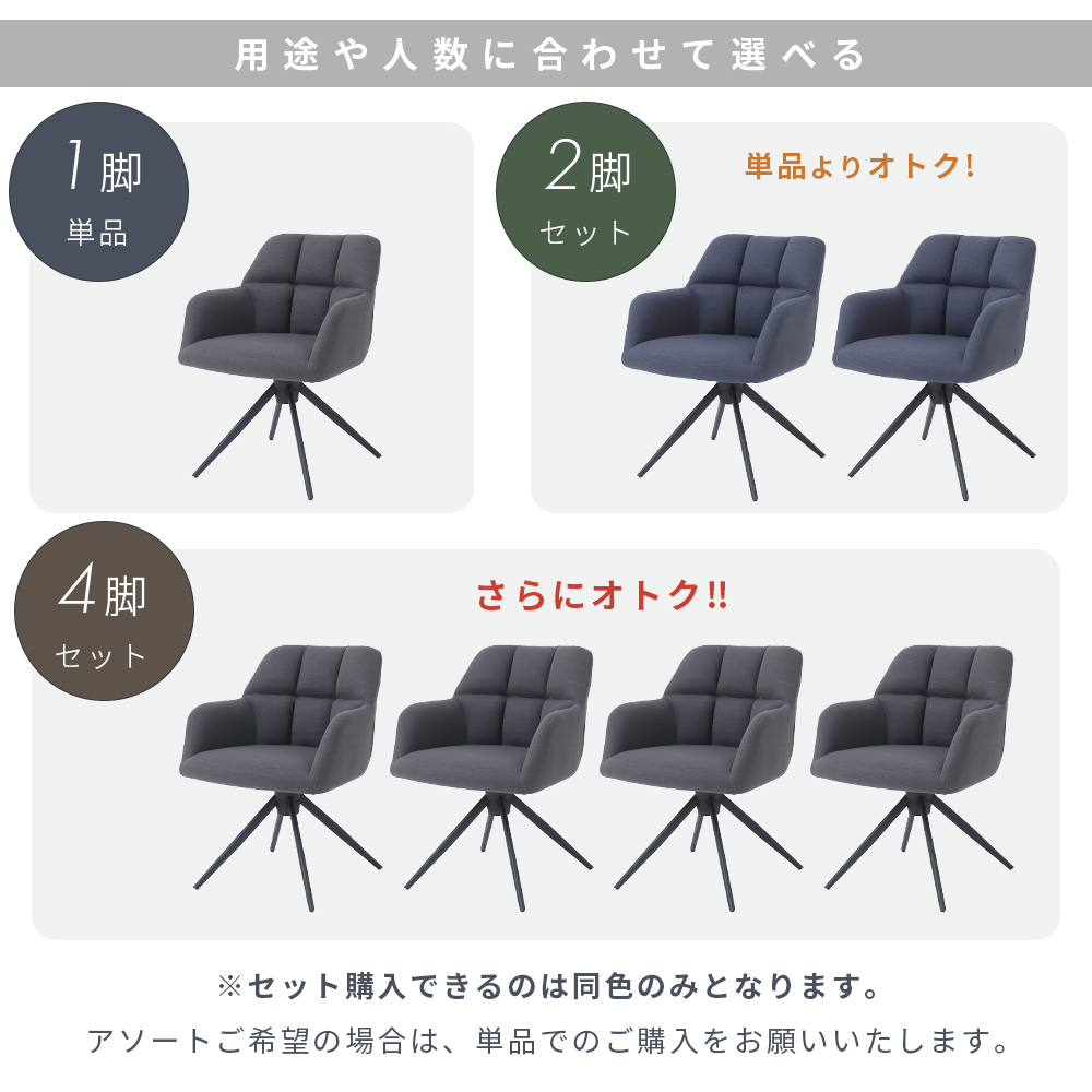 ダイニングチェア 回転式 回転チェア オートリターン 椅子 イス チェア 肘付き アームチェア ダイニング 椅子回転 食卓 ファブリック 撥水 布張り スチール脚 クッション 立ち座り楽 座りやすい 疲れにくい おしゃれ 北欧 モダン シンプル インテリア 組立簡単 ブルー グレー ネイビー ブラック 黒脚 アジャスター