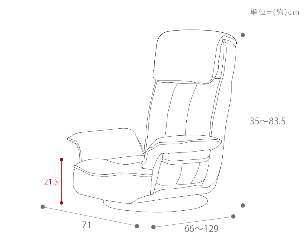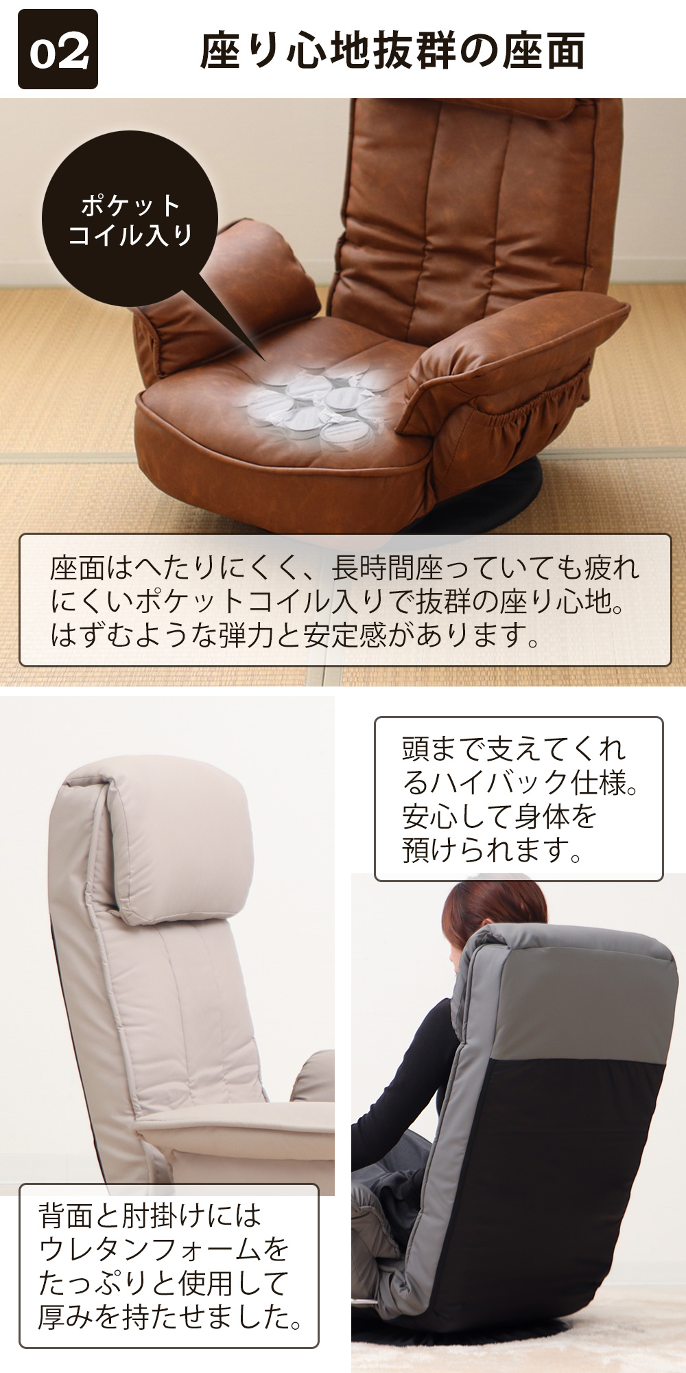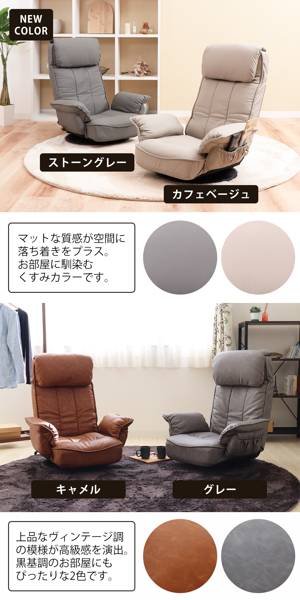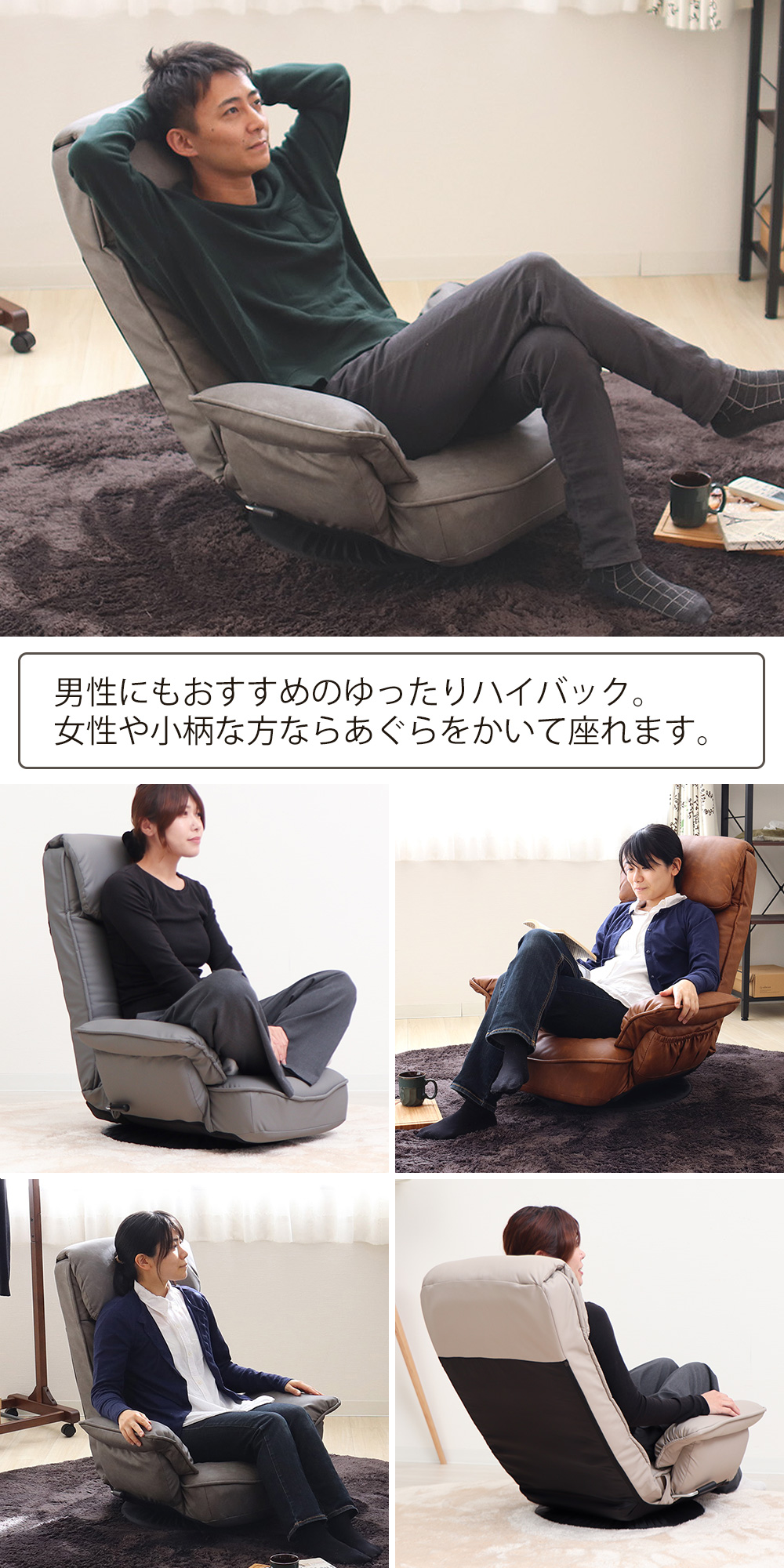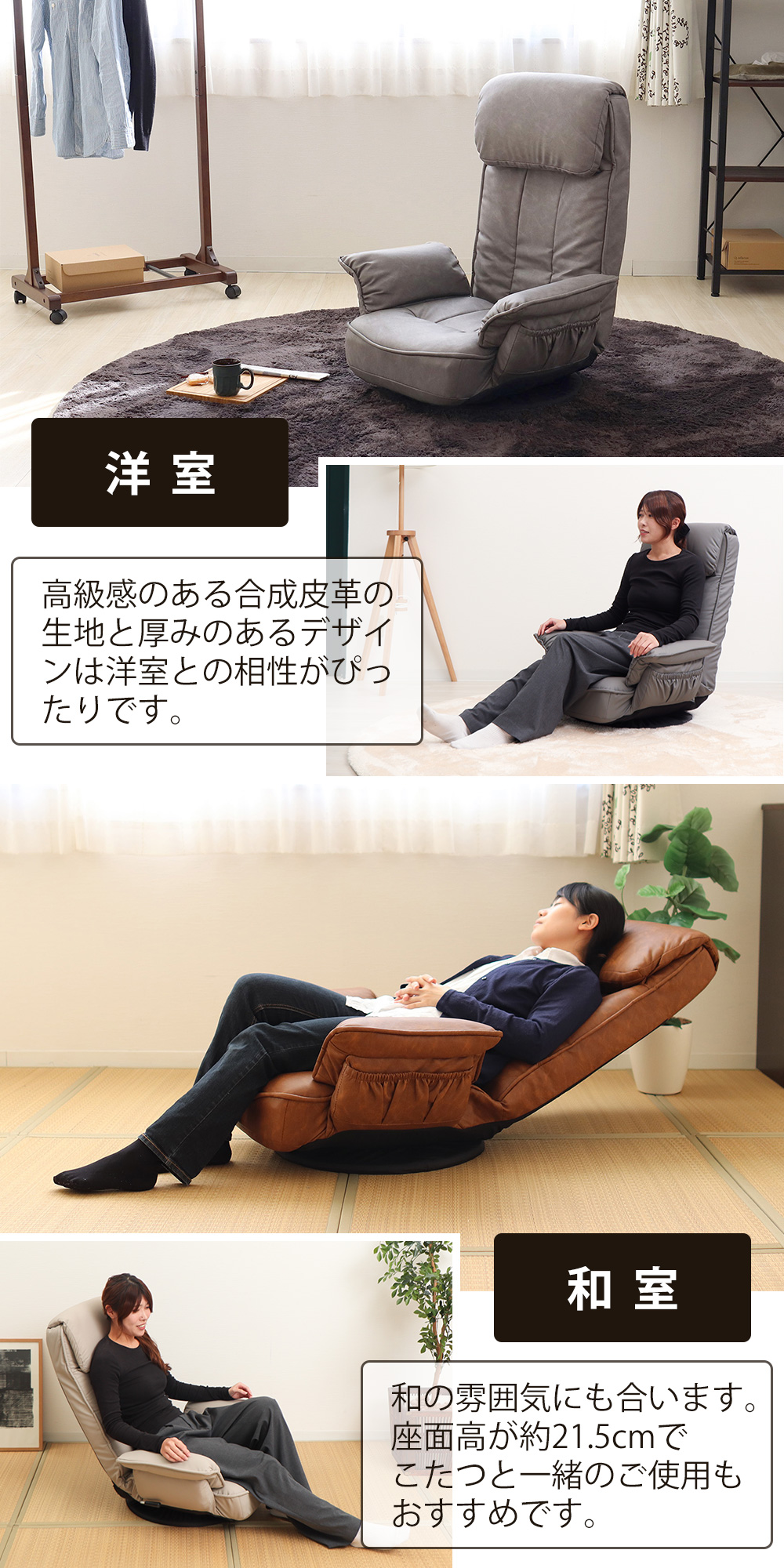 ゆったりとくつろげる、回転式リクライニング座椅子。上質な合成皮革を使用し、見た目も手触りもなめらか。汚れにくく、お手入れも簡単です。