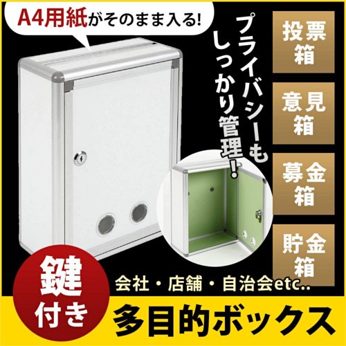 鍵付きBOX A4用紙対応 投入口大 募金箱/応募箱/投票箱/アンケートボックス/意見箱/シルバーホワイト W26cm H34cm