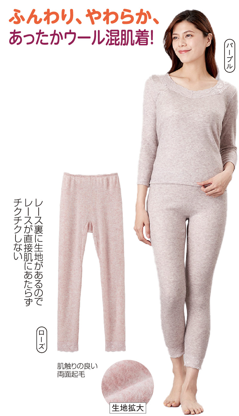 ふんわり、やわらか!あったかウール混肌着!肌触りの良い両面起毛。レース裏に生地があるので直接肌にあたらずチクチクしないです!
