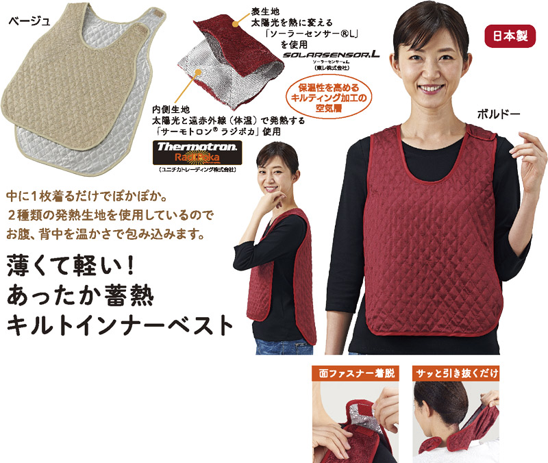 薄くて軽〜いあったかインナー。中に1枚着るだけでポカポカ!2種類の発熱生地を使用しているので、お腹や背中を暖かさで包み込みます。表生地は太陽光を熱に変える「ソーラーセンサー(R)L」内側には太陽光と遠赤外線(体温)で発熱する「サーモトロン(R)ラジポカ」を使用。キルティング加工でできた空気の層で保温性を高めます。