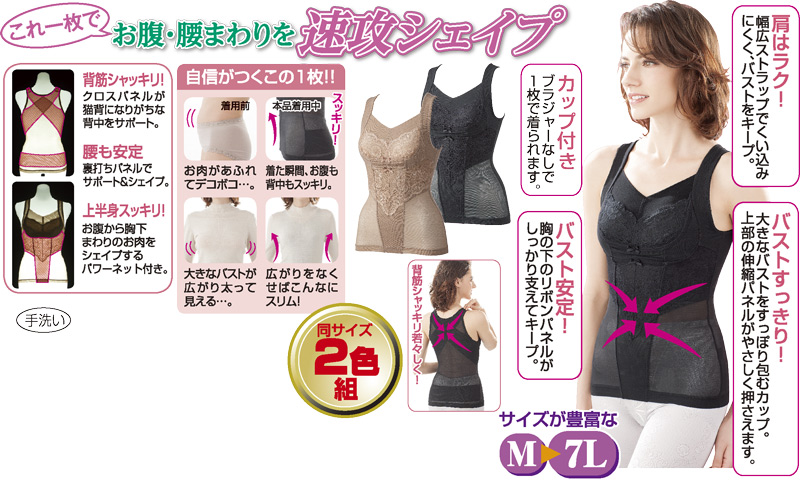 これ1枚でお腹・腰まわり。を速攻シェイプ!クロスパネルが猫背になりがちな背中をサポートし、背筋もシャッキリ。腰も安定し、お腹から胸下回りのお肉をシェイプするパワーネット付きなので上半身スッキリ!カップ付きでバストをすっぽり包み込み、上部の伸縮パネルがやさしく押さえます。胸の下のリボンパネルがしっかり支えてバストが安定!幅広ストラップでくい込みにくく肩は楽ですよ♪
