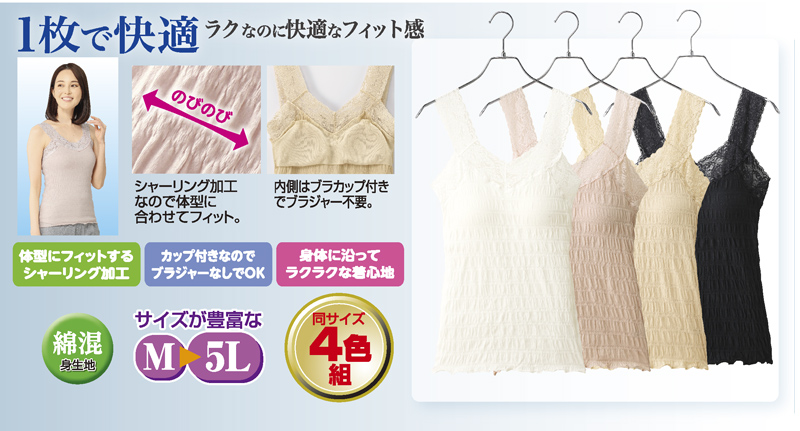 カップ付きなのでブラジャーなしで着用できる爽やかキャミです。
