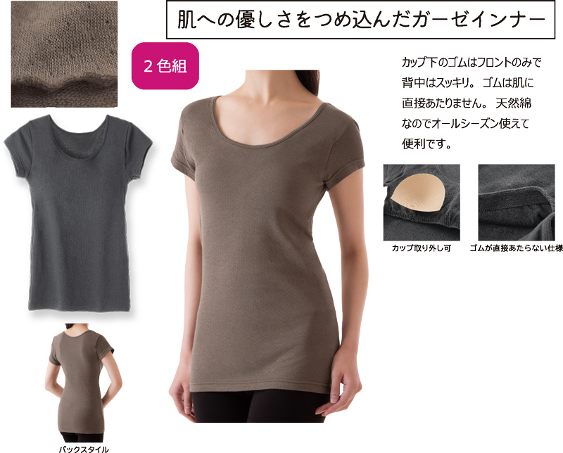 肌にやさしい綿ガーゼカップ付き3分袖インナー2色組