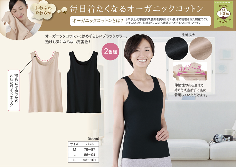 毎日着たくなるオーガニックコットン!ふわふわやわらかで伸縮性のある生地で締め付けすぎず、楽に着用していただけますよ♪めずらしいブラックカラーとベージュの2色組。襟もとはゆったりとしたワイドネックになっています。