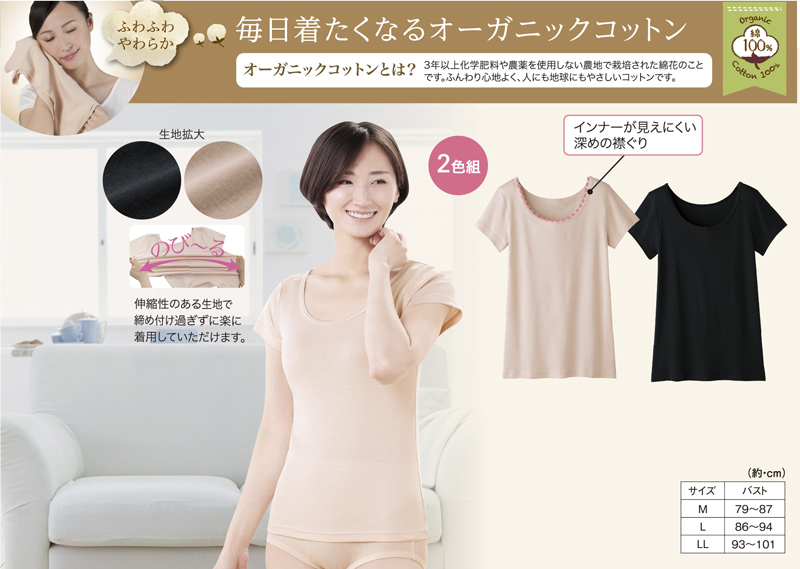 毎日着たくなるオーガニックコットン!ふわふわやわらかで伸縮性のある生地で締め付けすぎず、楽に着用していただけますよ♪めずらしいブラックカラーとベージュの2色組。インナーが見えにくい深めの襟ぐりになっています。