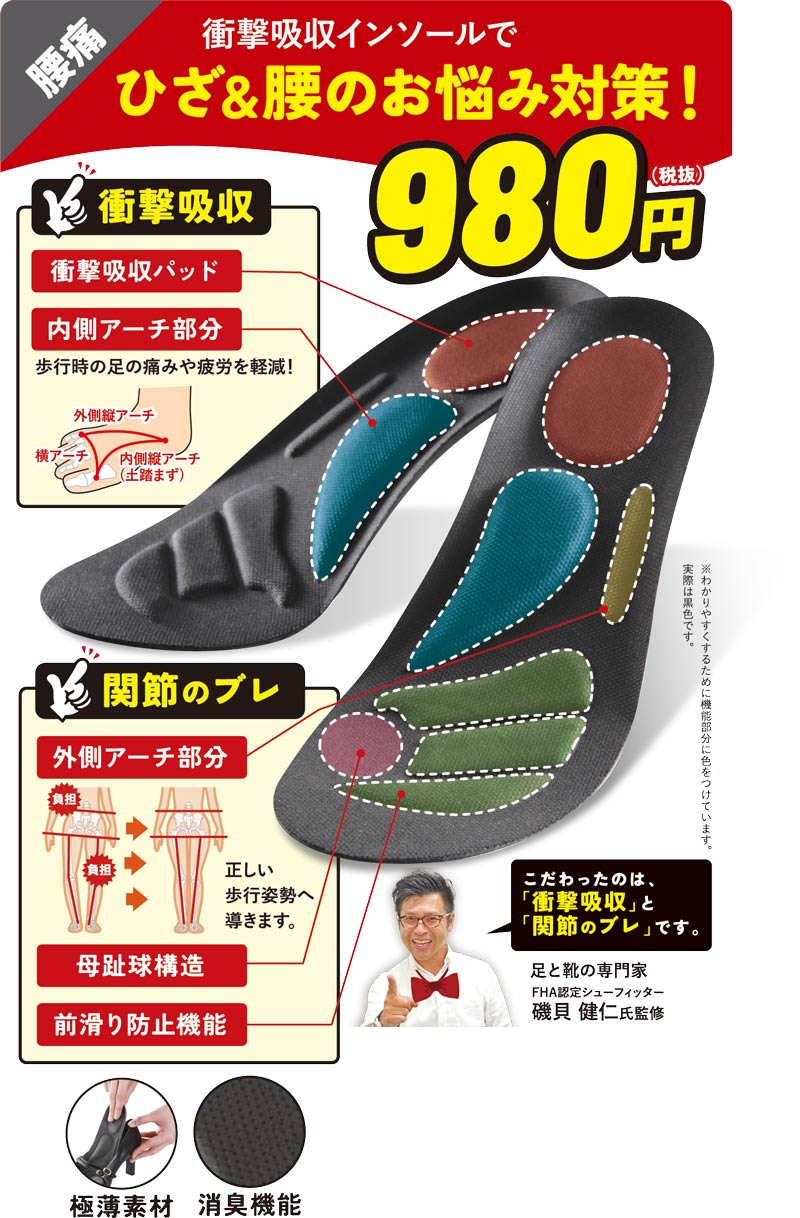 ひざ&腰対策インソール。こだわったのは『衝撃吸収』と『関節のブレ』!衝撃吸収?歩行時の足の痛みや疲労を軽減。関節のブレ?グラ付きを防止し正しい歩行姿勢へ導きます。約3の極薄素材なのでお手持ちの靴にすっぽり♪しかも消臭機能付きで嬉しいですね♪