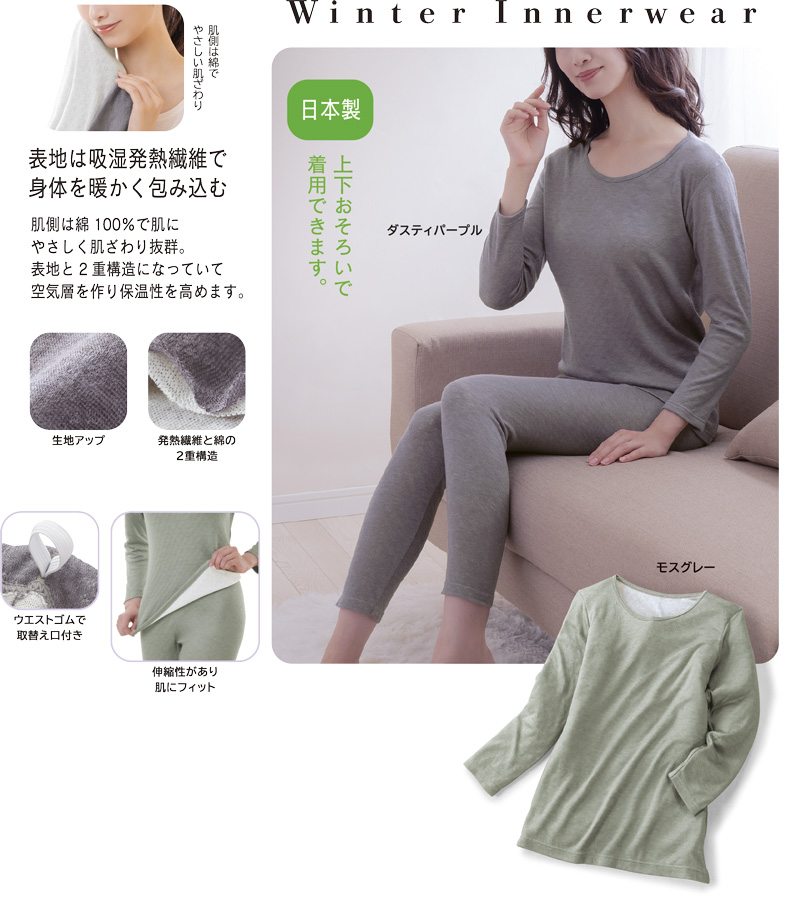 表地は吸湿発熱繊維で身体を暖かく包み込んでくれます。