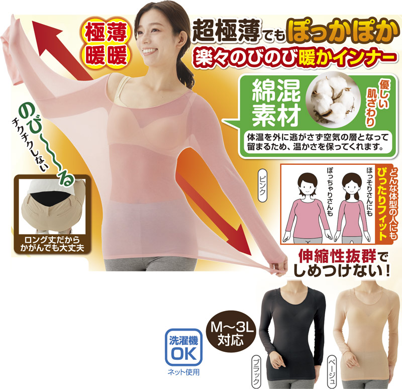 楽々のびのび暖かインナー。超極薄でもぽっかぽか!体温を外に逃がさず空気の層を作り、温かさを保ってくれる綿混素材を使用しています。伸縮性抜群で、どんな体型の人にもぴったりフィットして、しめつけないのが良いですよ♪