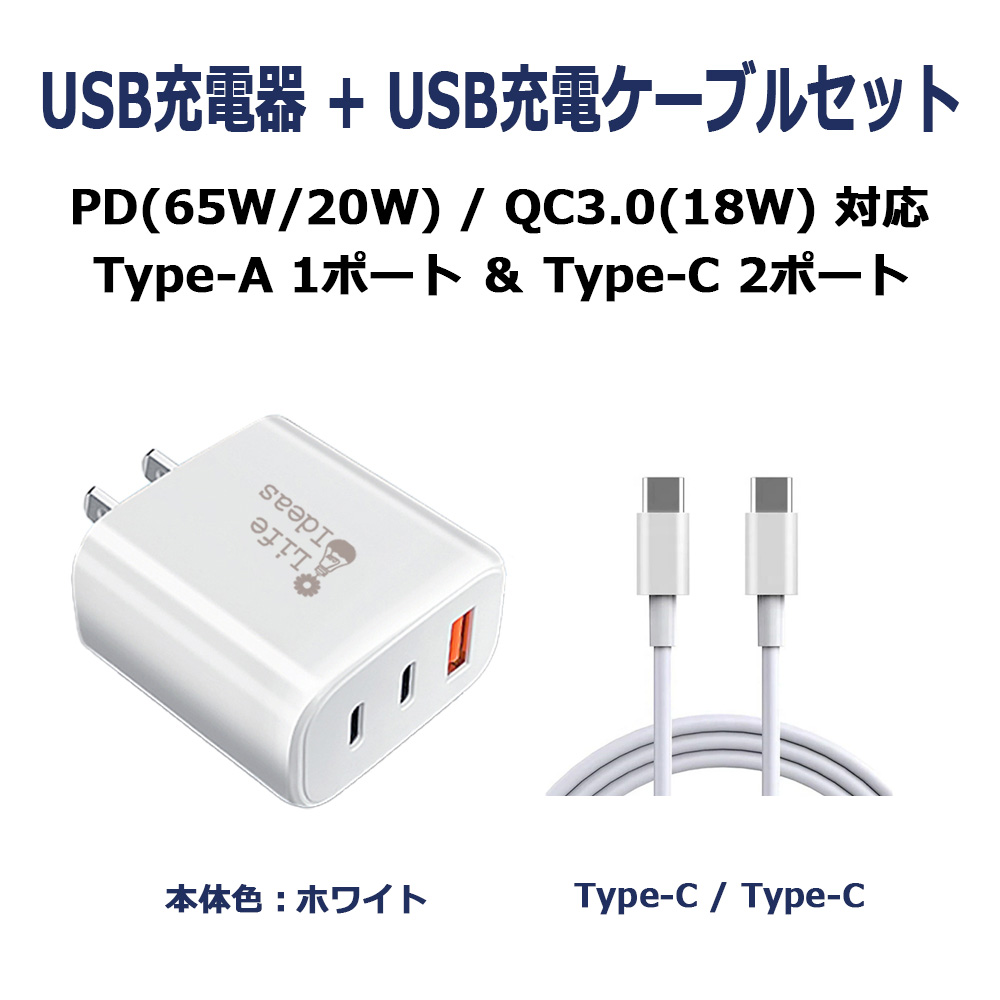 USB充電器 Type-C/PD/65W Type-A/QC3.0/18W PPS対応 3ポート同時充電 ホワイト Type-C充電ケーブル付 1年保証[M便 1/3]