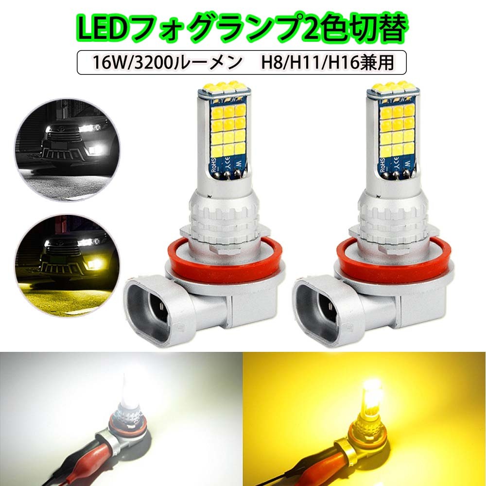 LEDフォグランプ H8/H11/H16兼用 DC12V 3200ルーメン 2色切替 ホワイト(6000K)/イエロー(3000K) 2本セット 1年保証