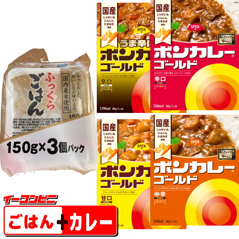 ドリームズファームふっくらごはん3食パック×4個(計12食)とボンカレー ゴールド12個のセットです。