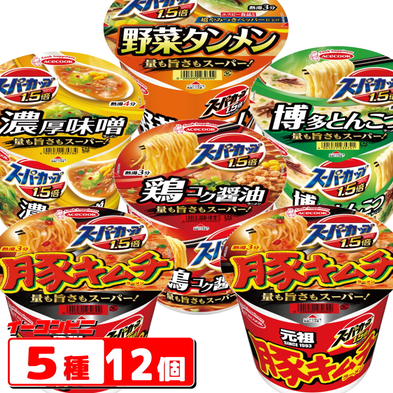 エースコック スーパーカップ 5種類 計12個セット 豚キムチ/しょうゆ/みそ/とんこつ/野菜タンメン 大盛ラーメン