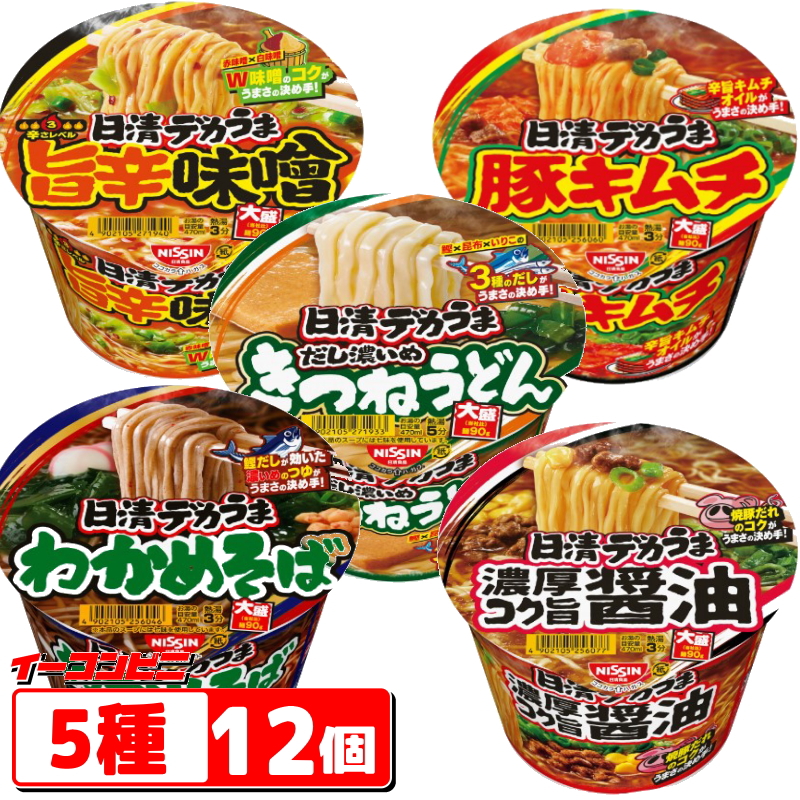 日清 デカうま 5種 詰め合わせ(計12個) 【豚キムチx4/濃厚コク旨醤油x2/旨辛味噌x2/わかめそばx2/きつねうどんx2】