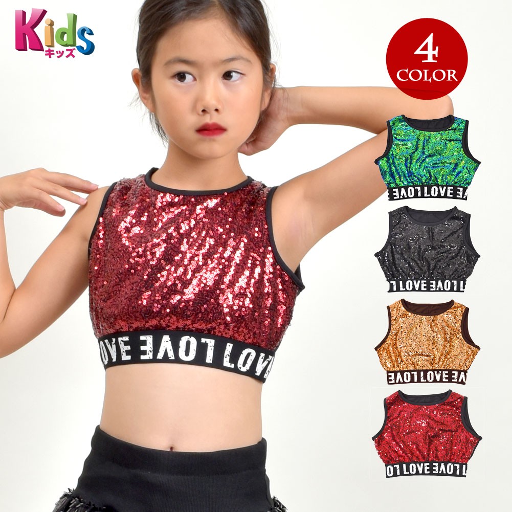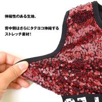 | おすすめ ポイント | ■スパンコールが光ってカッコよく、ステージ映え抜群★ ■アンダー部分は可愛いロゴ入りのゴム♪ダンス中にずれることなく着用できます!! ■Mサイズは120〜130cm、Lサイズは140〜150cmのお子様向け。 ■正面側はびっしりスパンコール、背中側は伸縮性のある生地です。 |