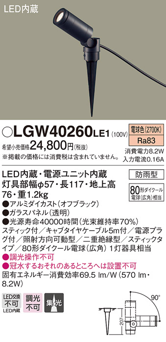 【法人様限定】パナソニック LGW40260LE1 LEDスポットライト 電球色 地中埋込型 集光 防雨型