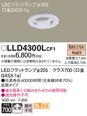 【光源】<br>◆LEDフラットランプφ205 クラス700(口金GX53-1a)<br>◆色温度:2700 K<br>◆光源寿命40000時間(光束維持率70%)<br><br>【寸法・質量】<br>◆幅:φ205 mm<br>◆高:27 mm<br>◆質量:0.22 kg<br><br>【仕様・注意事項】<br>◆全光束:930 lm<br>◆消費電力:7.8 W<br>◆消費効率:119.2 lm/W<br>◆Ra83<br>◆拡散タイプ<br>◆適合器具との組み合わせのみ使用可能<br>◆入力電流(100V時):0.13 A<br>◆調光操作不可