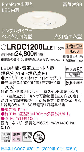 【法人様限定】パナソニック LRDC1200LLE1 LED軒下用ダウンライト 埋込穴φ150 浅型8H 高気密SB形 FreePa ペア点灯 拡散