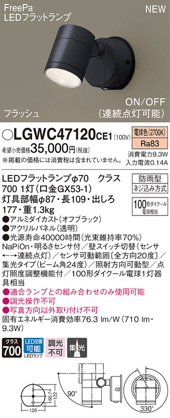 【法人様限定】パナソニック LGWC47120 CE1 LEDスポットライト 屋外用 壁直付 集光 防雨型・FreePa・フラッシュ 電球色