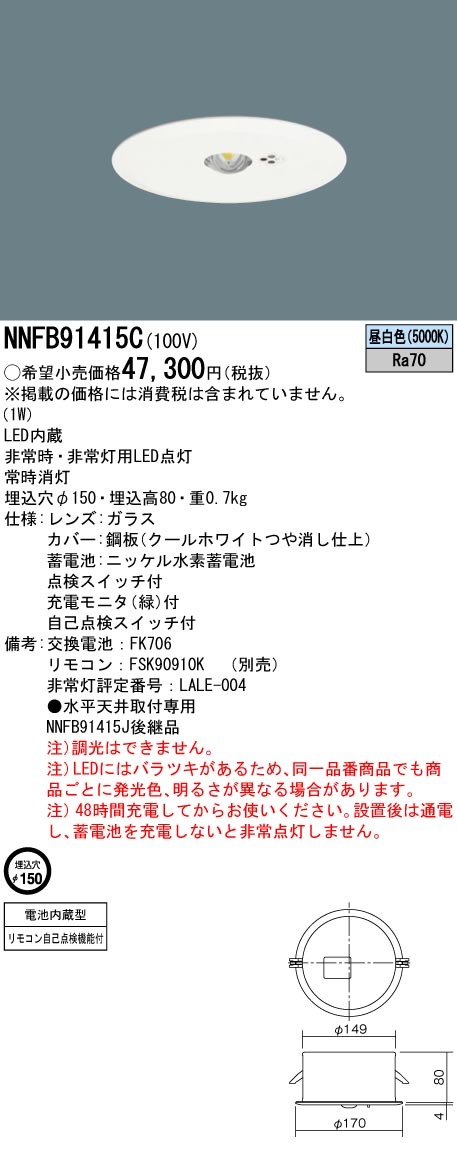 【法人様限定】パナソニック NNFB91415C LED非常用照明器具 天井埋込型 断熱/遮音施工用 LED低天井用(〜3m) 埋込穴φ150 昼白色