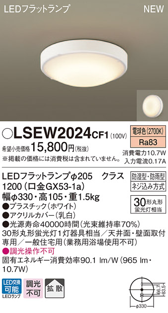 【法人様限定】パナソニック LSEW2024CF1 LED浴室灯 リニューアル用 電球色 拡散タイプ 防湿・防雨型 丸形蛍光灯30形1灯相当