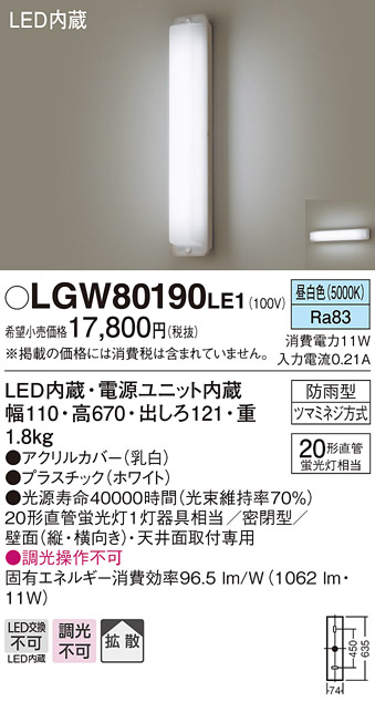 【法人様限定】パナソニック LGW80190LE1 LEDブラケット 昼白色 天井直付型 壁直付型 密閉型 防雨型 拡散タイプ