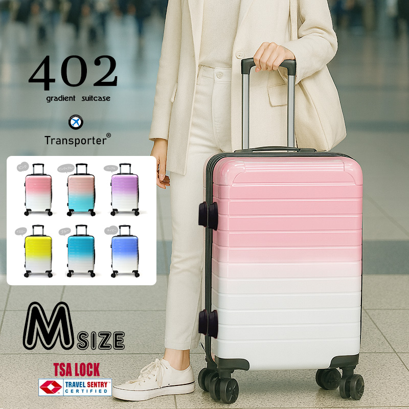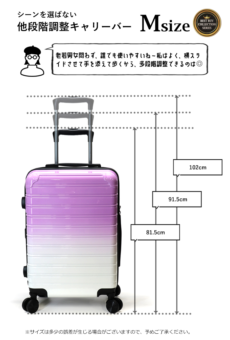 大人の遊び心が感じられるインパクト抜群のグラデーションボディ。 カラーは全6色ご用意致しました。 ディティールは、実用的な機能が満載で、側面に付いているファスナーをぐるりと一周開くと、横幅が拡張するアジャスター機能付! お土産などで荷物が増えた時でも、重宝する機能になっております。 またスーツケースの中で一番重量な役割を果たすキャスターは、 4輪ともワンタッチで取り外しが可能! 他にもアメリカ圏の旅行に適したTSAロックを採用するなど充実した機能が満載となっております。 素材はABS+ポリカーボネイトを使用しておりますので、丈夫で長く愛用して頂ける仕上がりとなっております。 | ||||
