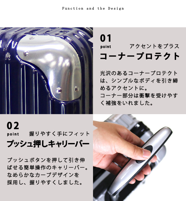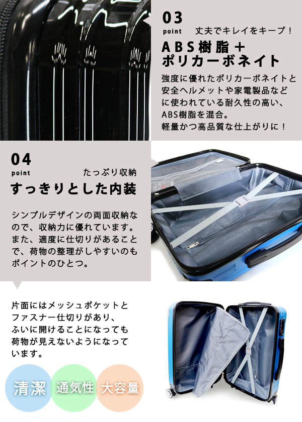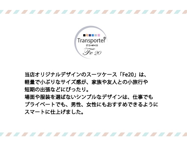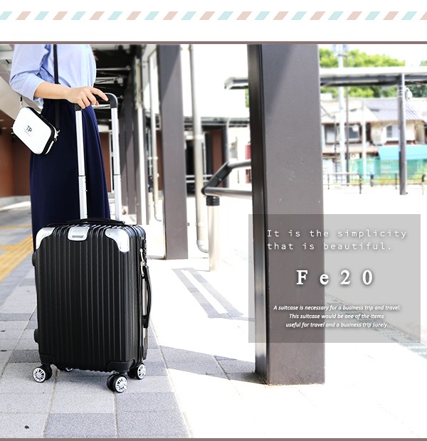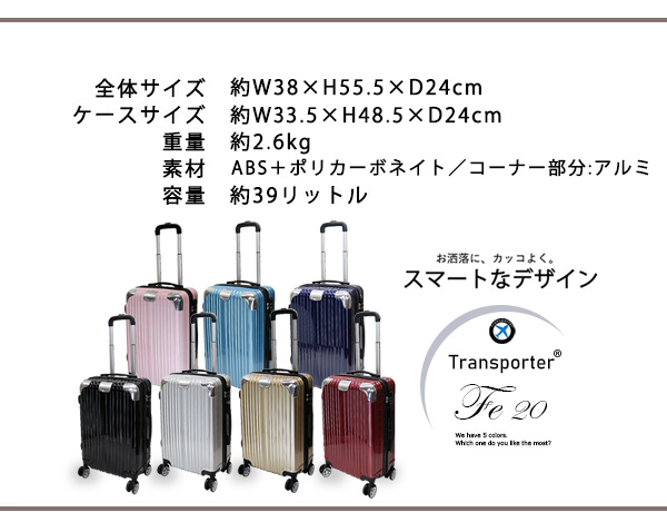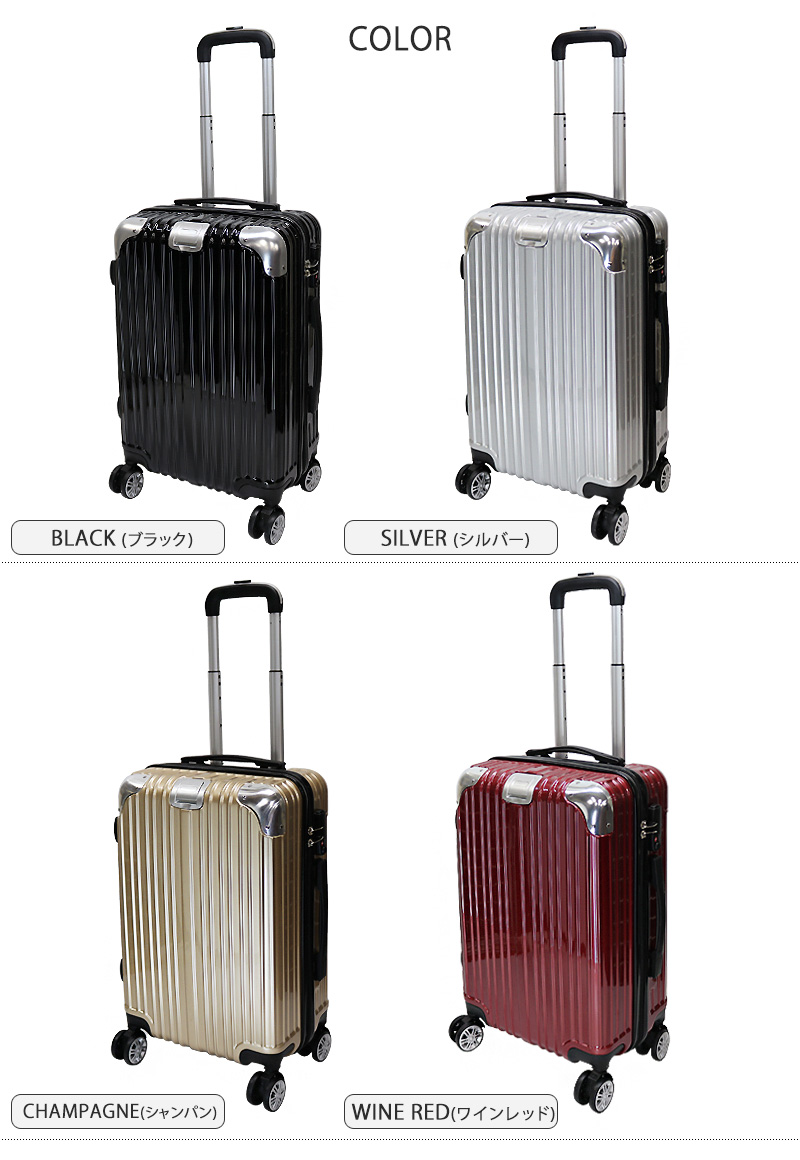 | コーナープロテクトがアクセントのお洒落なスーツケース。強度に優れたポリカーボネイトとABSを混合した素材は、本体のキズや汚れに強く、長く愛用できる高品質な仕上がりとなっております。また衝撃を受けやすいコーナー部分には、アルミの補強を入れ、衝撃カバーを強化しております。機能性だけでなく見た目のデザインも飽きのこない、高級感に満ちた仕上がりとなっております。友達との旅行にも、修学旅行にも、家族のお出かけにも、短期の出張にも◎ 使う場面を選ばないデザインなので 年齢問わず ご使用頂けます。 内装は汚れに強い生地を使用しファスナーでお荷物をまとめて頂けます。 本体裏生地ファスナーに関しましては、修理用ファスナーとなりますので 通常はご使用頂けませんよう予めご了承下さいませ。航空会社により機内持ち込みが可能になります。機内持ち込みに関しましてはサイズ規定が異なりますので予め各航空会社のホームページを確認して頂けます様よろしくお願いします。※LCCを除く航空会社で機内持ち込みしていただけます。また路線、飛行機の種類により機内に持ち込む事が出来ない場合がございますので、予めご了承願います。 | |